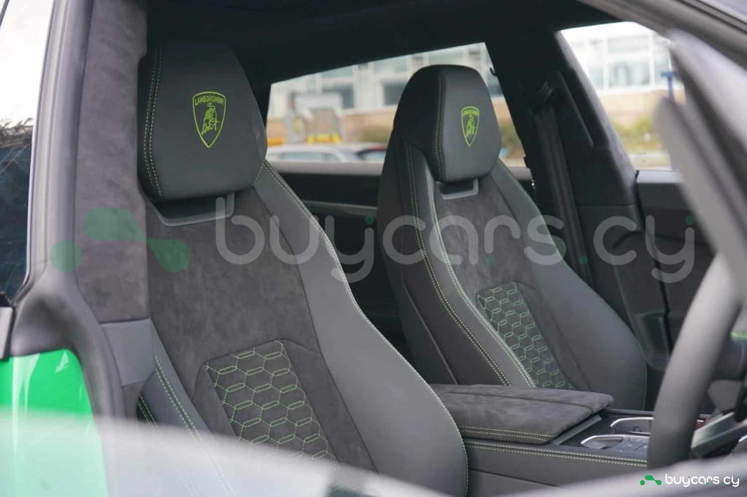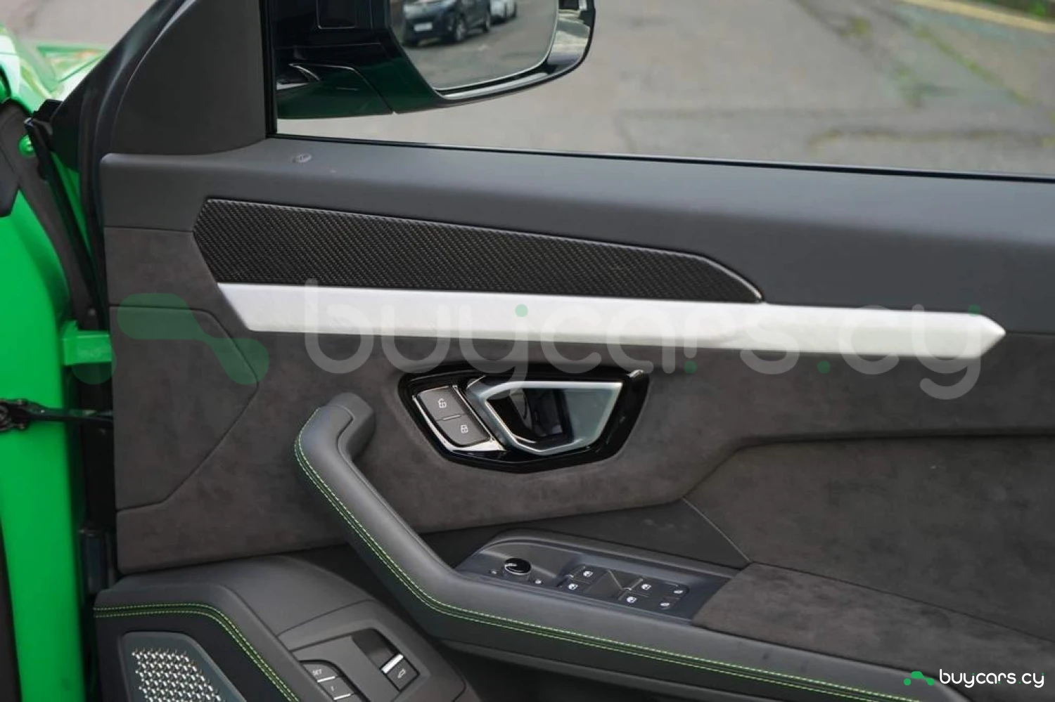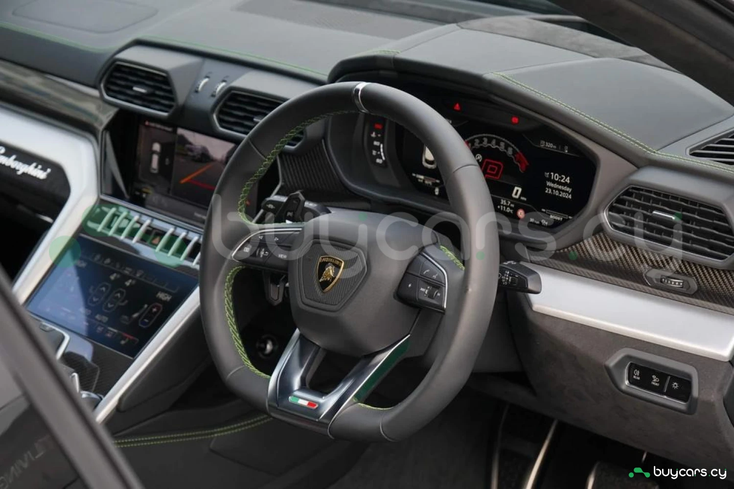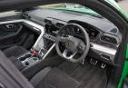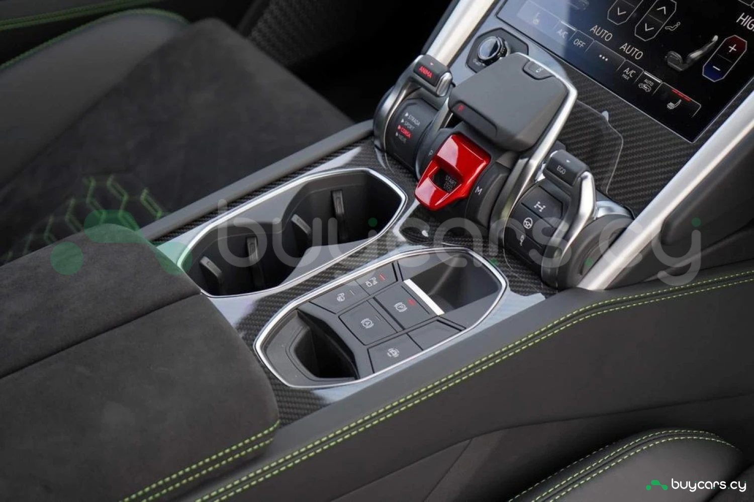 Комфорт и интерьер: Интерьер выполнен в обивке Nero Ade (однотонная кожа) с эксклюзивной алькантарой Q-Citura. Карбоновый интерьерный пакет (Small Interior Carbon Package) добавляет спортивный стиль. Многофункциональный подогреваемый руль из гладкой кожи, а также фирменная вышивка логотипа Lamborghini на подголовниках подчеркивают уровень премиального комфорта. Дополнительно установлены полы с кожаной окантовкой и двойной строчкой, а также опциональная прострочка интерьера и руля.