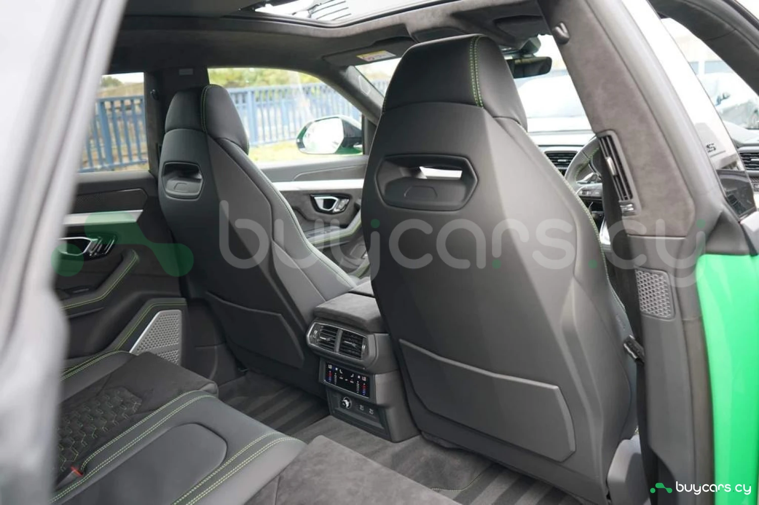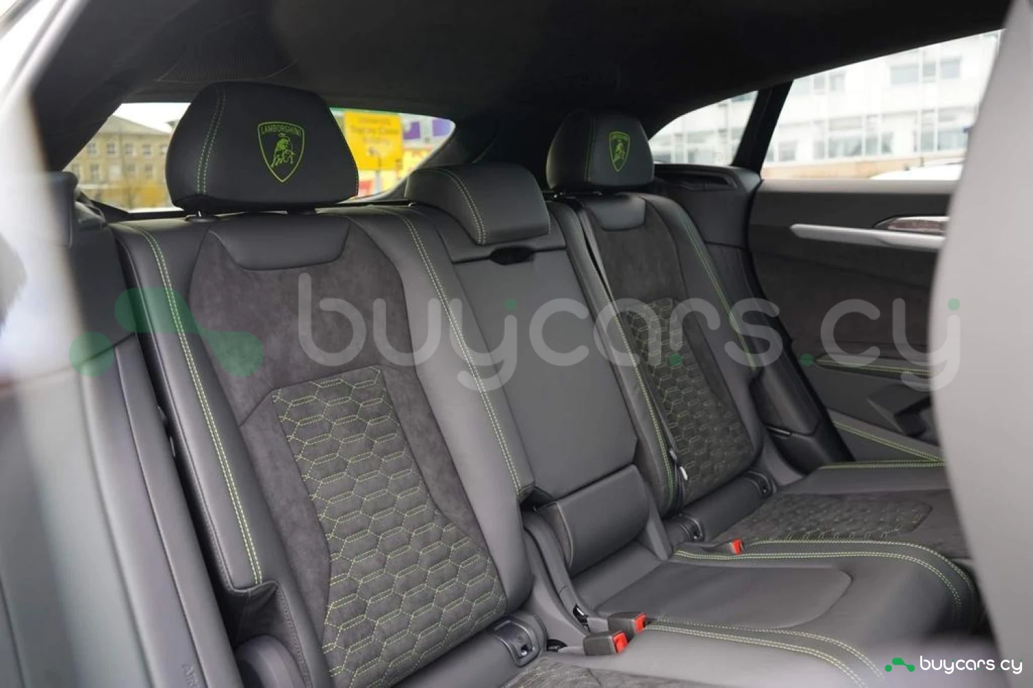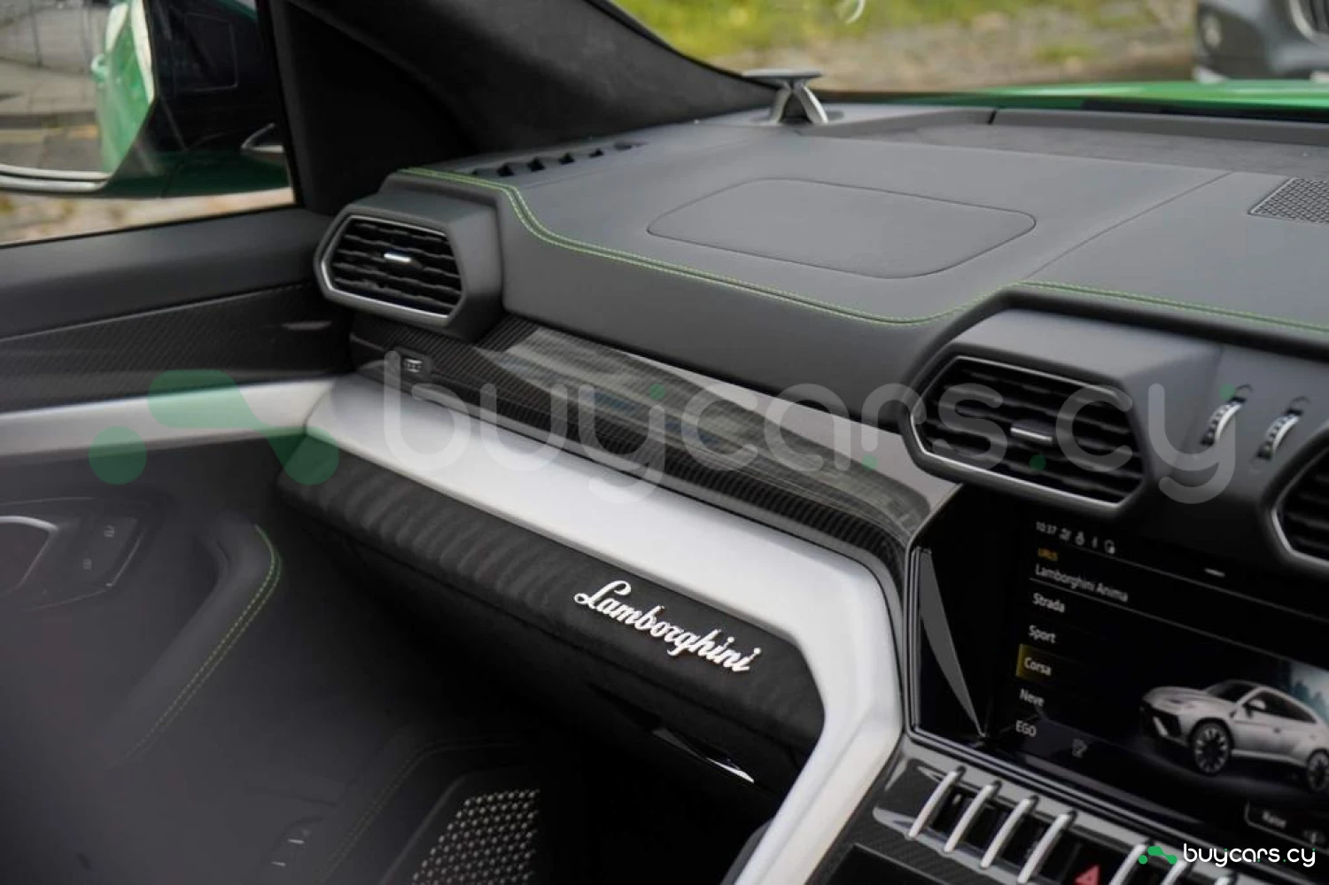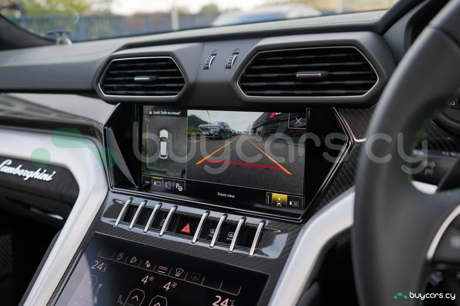 Комфорт и интерьер: Интерьер выполнен в обивке Nero Ade (однотонная кожа) с эксклюзивной алькантарой Q-Citura. Карбоновый интерьерный пакет (Small Interior Carbon Package) добавляет спортивный стиль. Многофункциональный подогреваемый руль из гладкой кожи, а также фирменная вышивка логотипа Lamborghini на подголовниках подчеркивают уровень премиального комфорта. Дополнительно установлены полы с кожаной окантовкой и двойной строчкой, а также опциональная прострочка интерьера и руля.