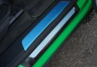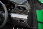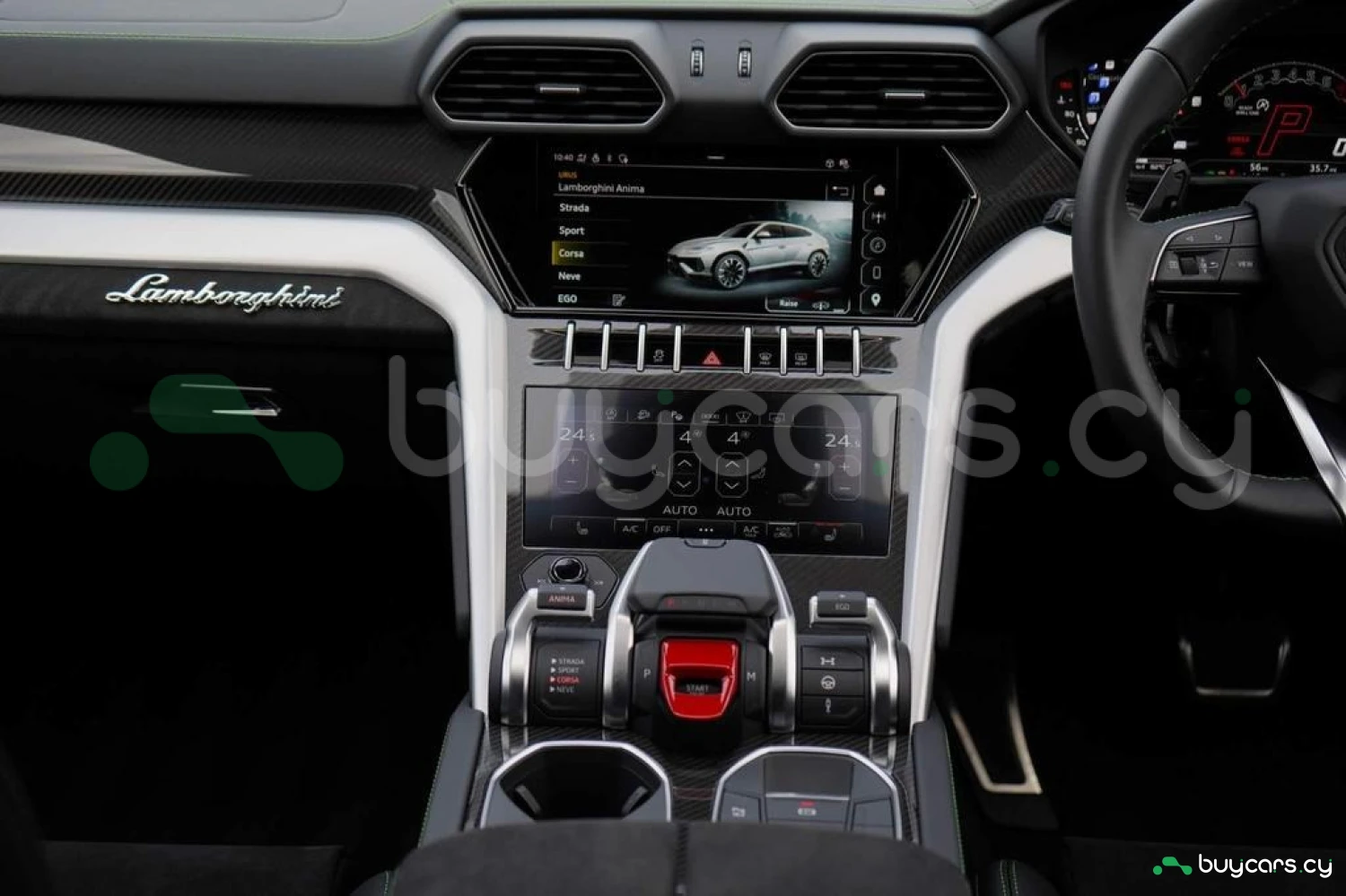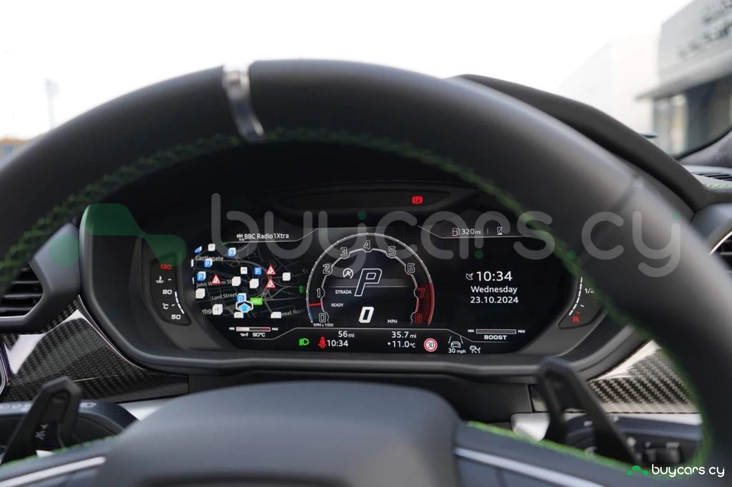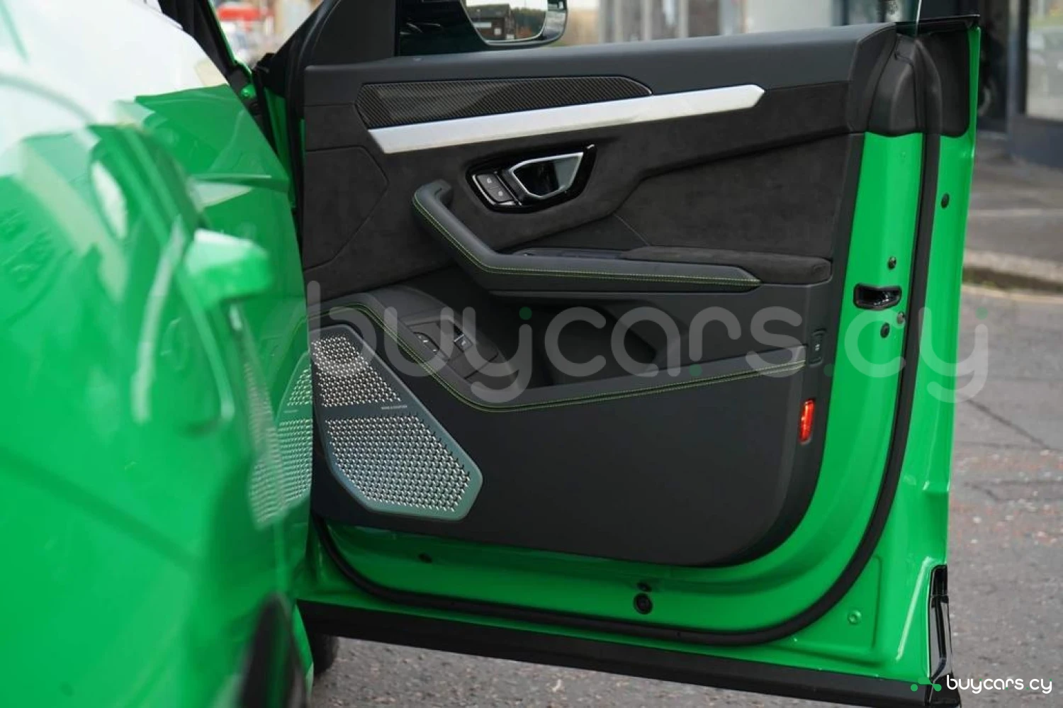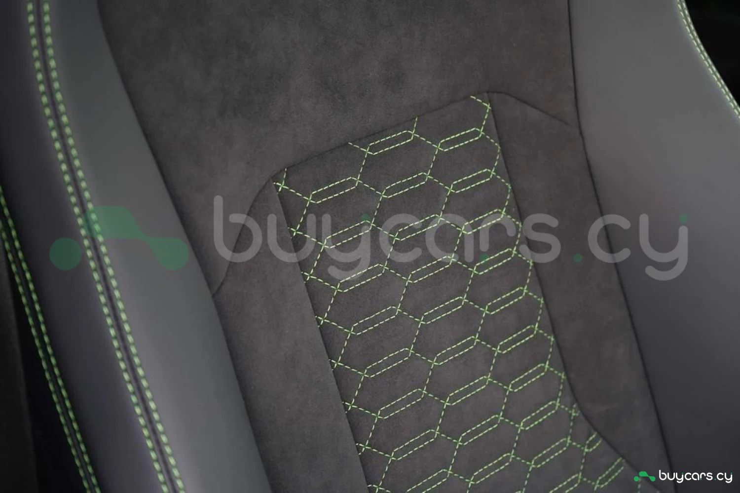 Комфорт и интерьер: Интерьер выполнен в обивке Nero Ade (однотонная кожа) с эксклюзивной алькантарой Q-Citura. Карбоновый интерьерный пакет (Small Interior Carbon Package) добавляет спортивный стиль. Многофункциональный подогреваемый руль из гладкой кожи, а также фирменная вышивка логотипа Lamborghini на подголовниках подчеркивают уровень премиального комфорта. Дополнительно установлены полы с кожаной окантовкой и двойной строчкой, а также опциональная прострочка интерьера и руля.