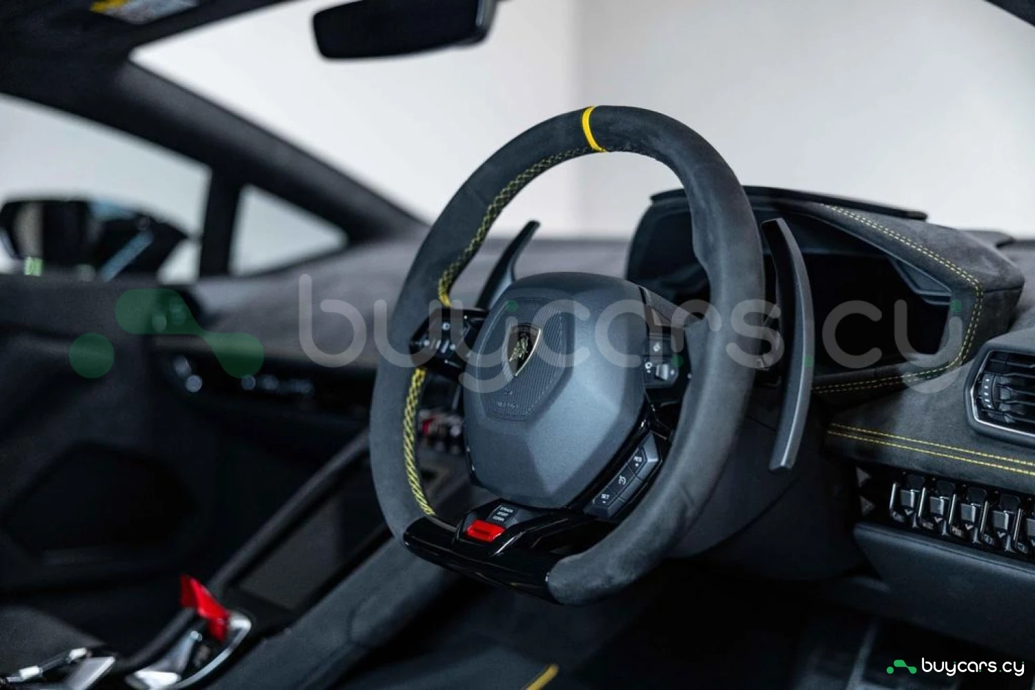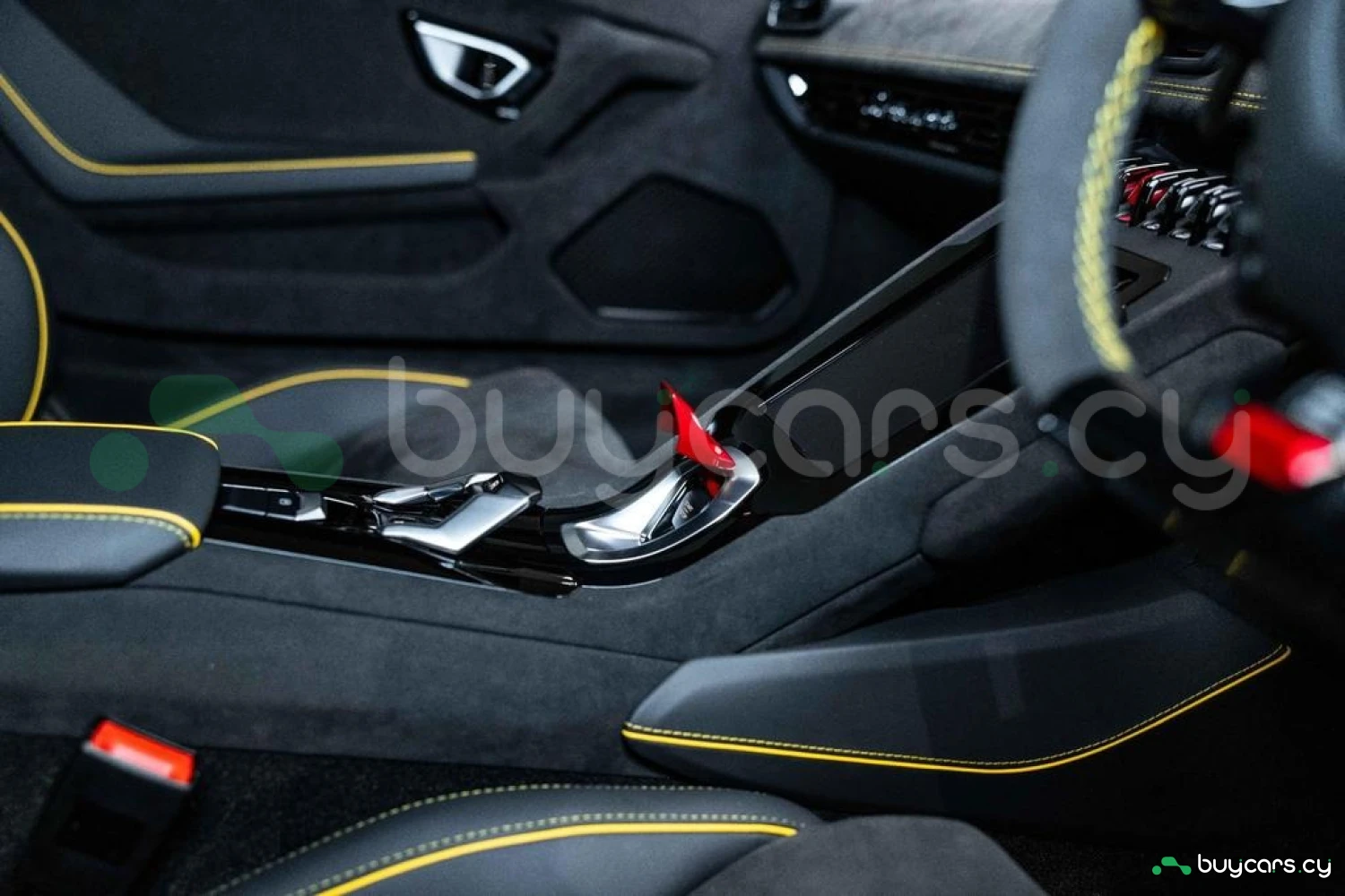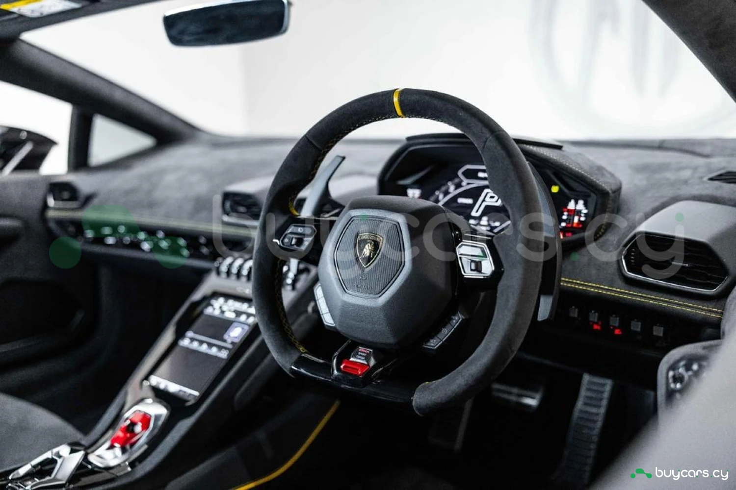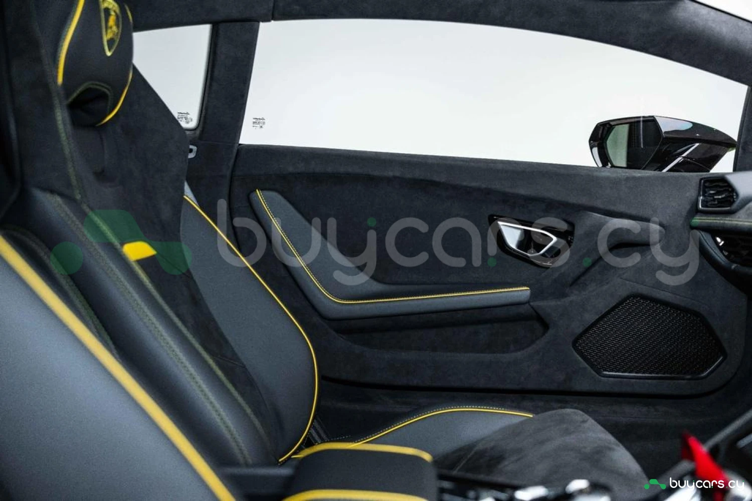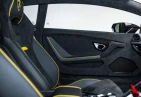 Интерьер: Салон выполнен в эксклюзивной отделке из алькантары и кожи Nero Ade с контрастной прострочкой Giallo Taurus, создавая элегантную, но агрессивную атмосферу. Дополнительные вставки из алькантары на верхней панели приборов и потолке, а также многослойная задняя стенка из алькантары подчеркивают роскошь интерьера. Вышитый логотип Lamborghini на подголовниках добавляет премиальности. Интегрированные элементы управления на руле, удобные отсеки для хранения в дверях и под центральной консолью, а также закрывающиеся бардачки делают салон еще более функциональным.