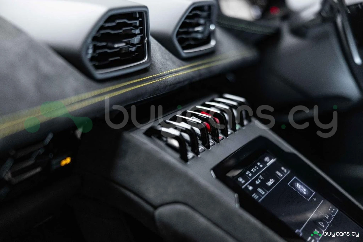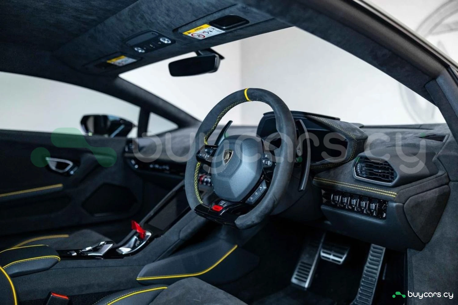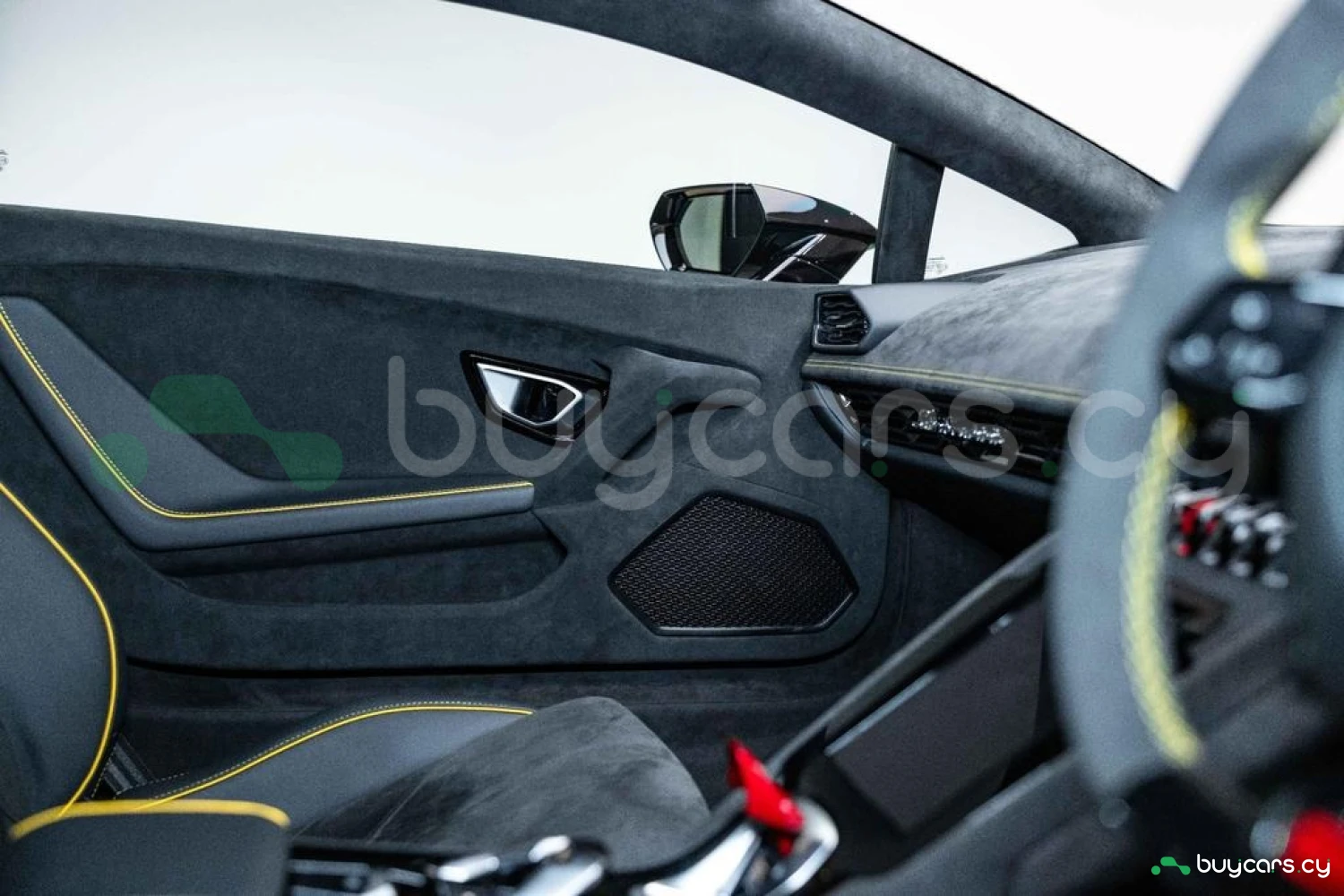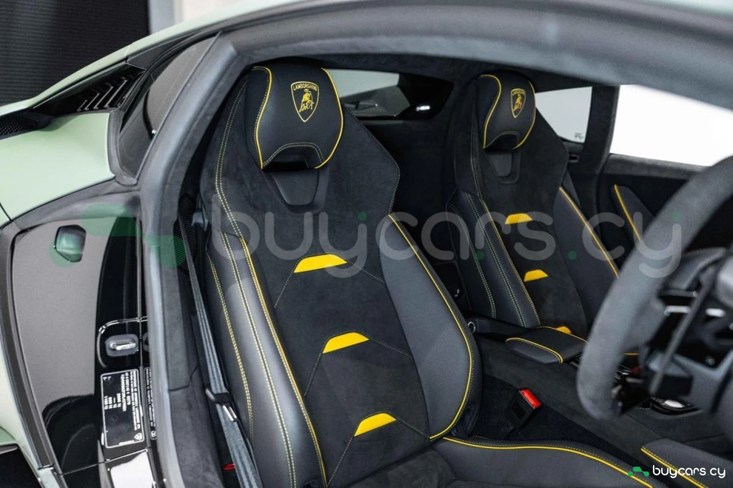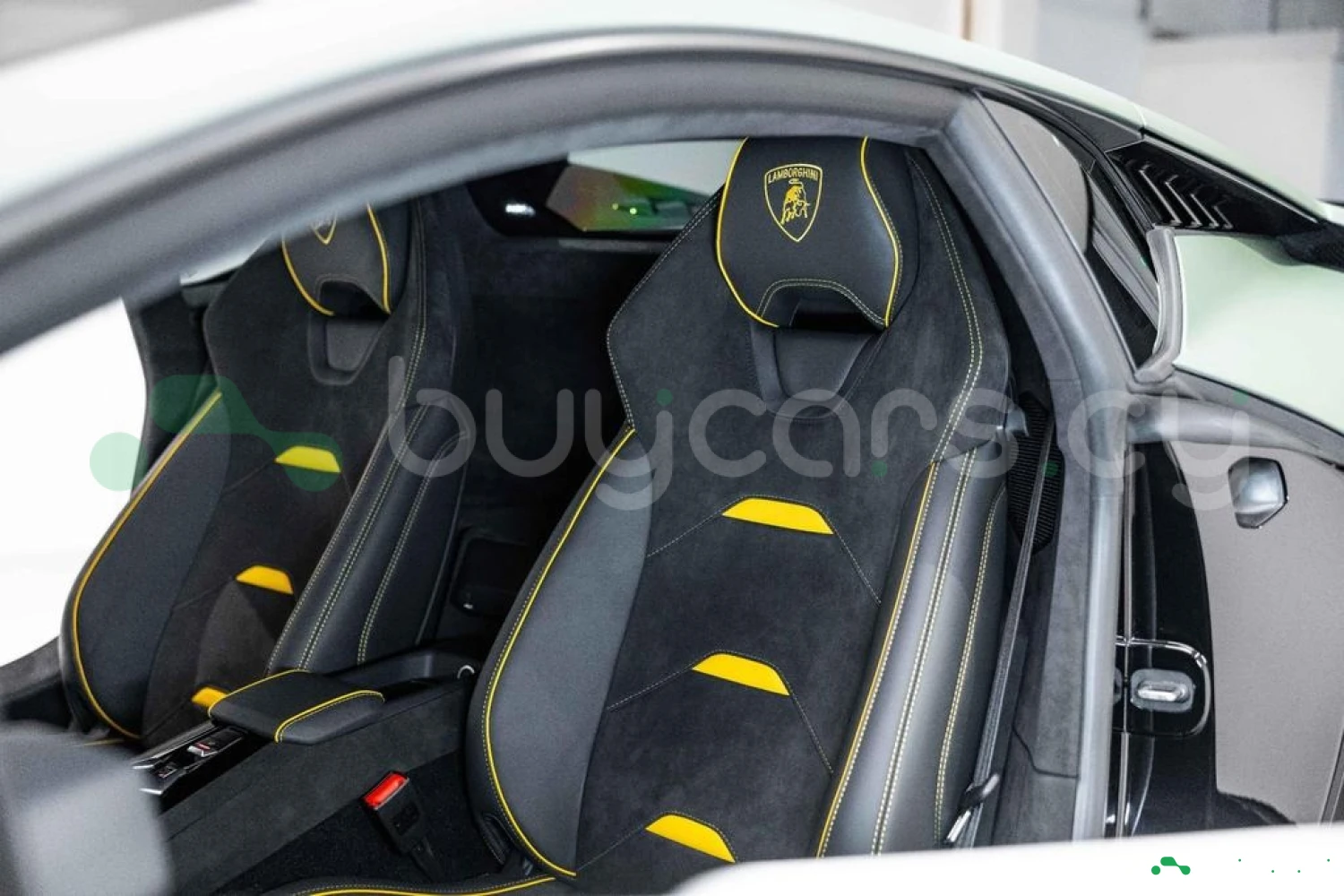 Интерьер: Салон выполнен в эксклюзивной отделке из алькантары и кожи Nero Ade с контрастной прострочкой Giallo Taurus, создавая элегантную, но агрессивную атмосферу. Дополнительные вставки из алькантары на верхней панели приборов и потолке, а также многослойная задняя стенка из алькантары подчеркивают роскошь интерьера. Вышитый логотип Lamborghini на подголовниках добавляет премиальности. Интегрированные элементы управления на руле, удобные отсеки для хранения в дверях и под центральной консолью, а также закрывающиеся бардачки делают салон еще более функциональным.