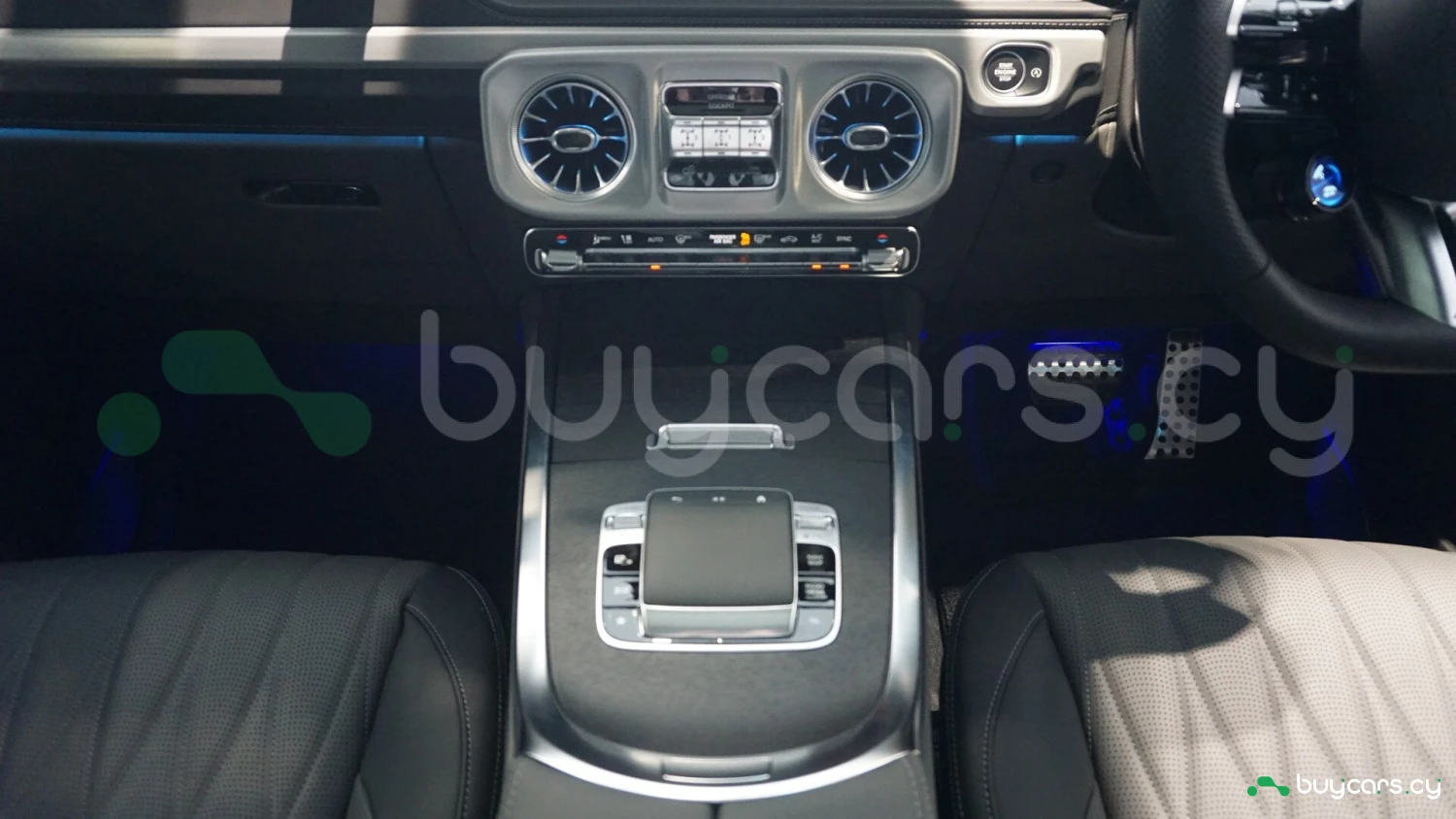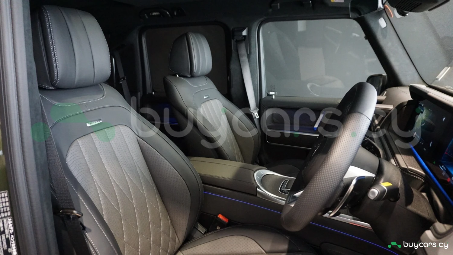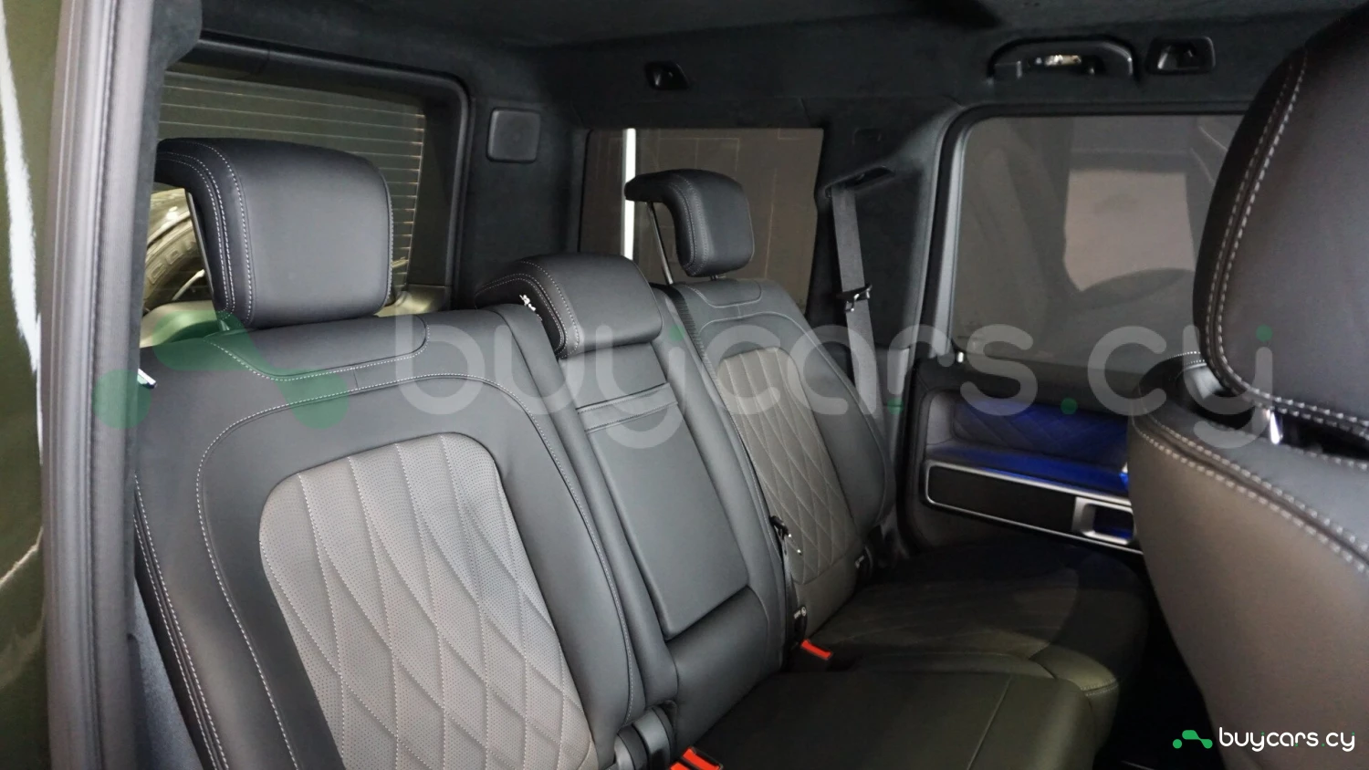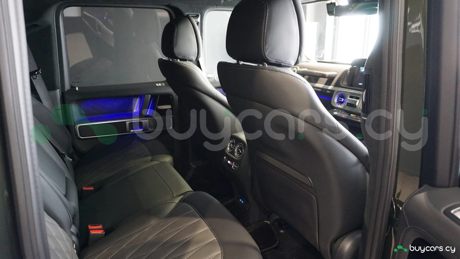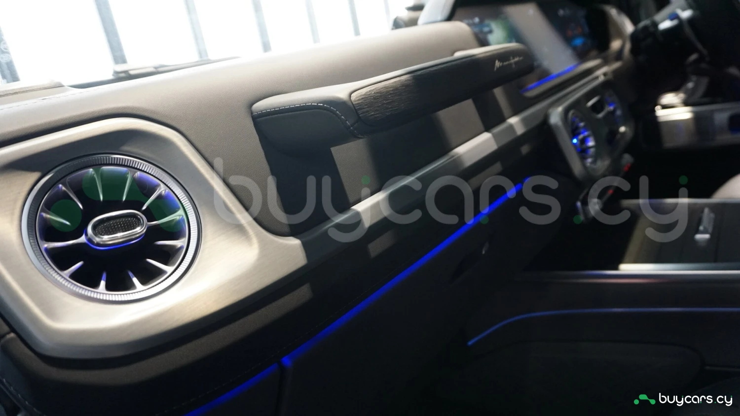 Салон G63 сочетает премиальную роскошь с внедорожной прочностью. Отделка из кожи Nappa с прострочкой AMG, вставки из карбона или дерева, спортивный руль AMG с плоским ободом и металлическими лепестками переключения. Два дисплея по 12.3 дюйма (приборная панель и мультимедиа MBUX), поддержка Apple CarPlay и Android Auto (беспроводные), премиальная аудиосистема Burmester, подогрев и вентиляция сидений (включая задний ряд), панорамная крыша и настраиваемая подсветка создают атмосферу максимального комфорта. Автомобиль рассчитан на 5 посадочных мест.
