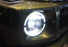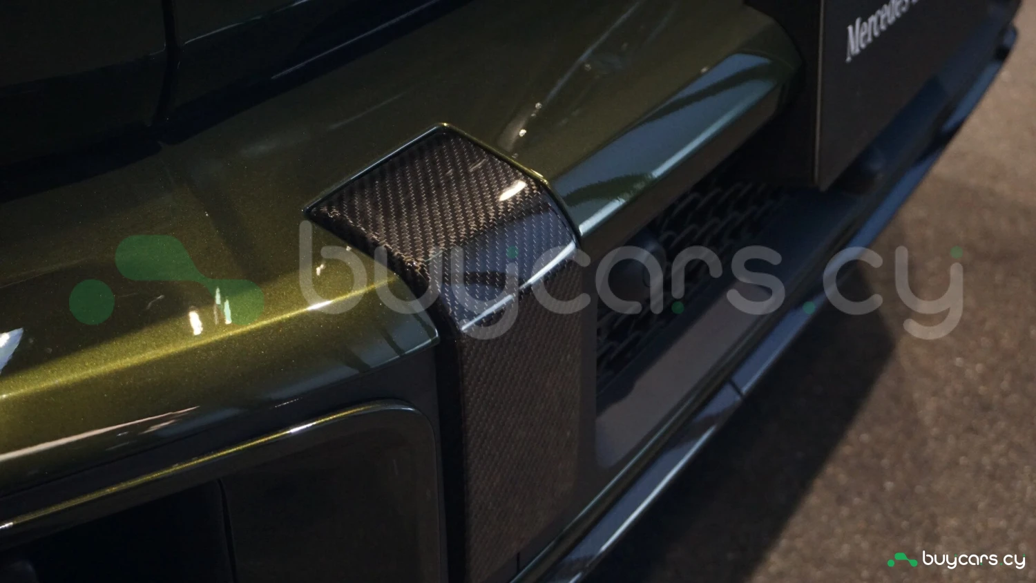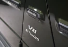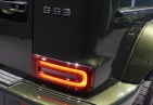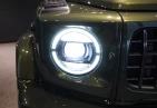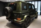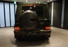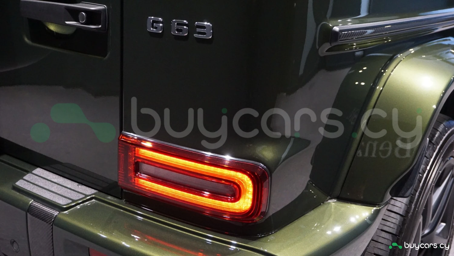 Mercedes-AMG G63 2025 года сохраняет культовый угловатый силуэт, дополненный выразительными элементами AMG. Впереди расположена фирменная решётка Panamericana, круглые светодиодные фары и массивные бамперы. Расширенные колесные арки вмещают 22-дюймовые легкосплавные диски AMG, а боковые патрубки выхлопной системы и матовые хромированные вставки подчёркивают агрессивный стиль. Прямые линии кузова, открытые петли дверей и вертикальное остекление придают автомобилю узнаваемый и мощный облик.