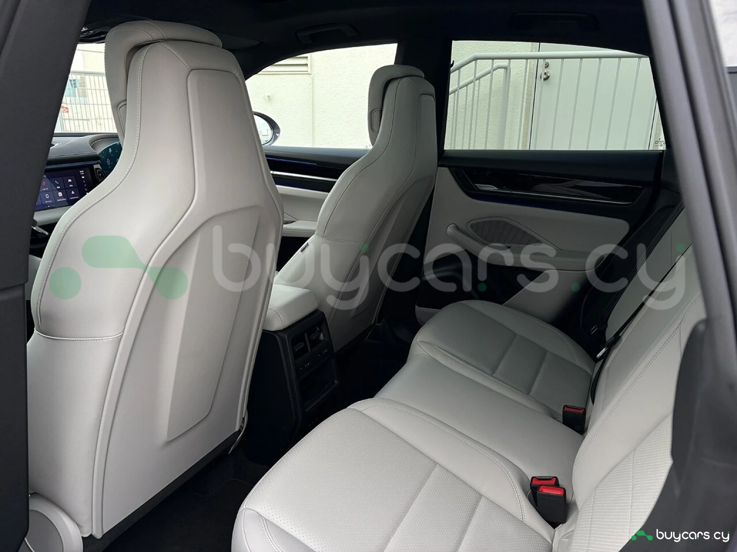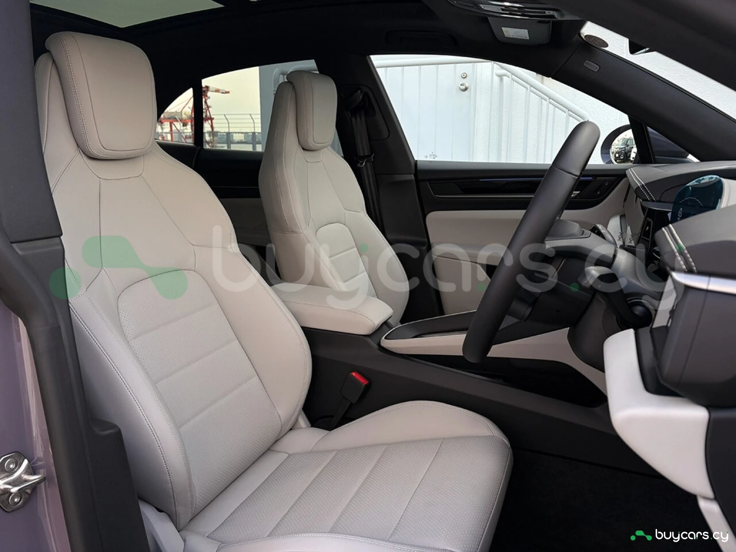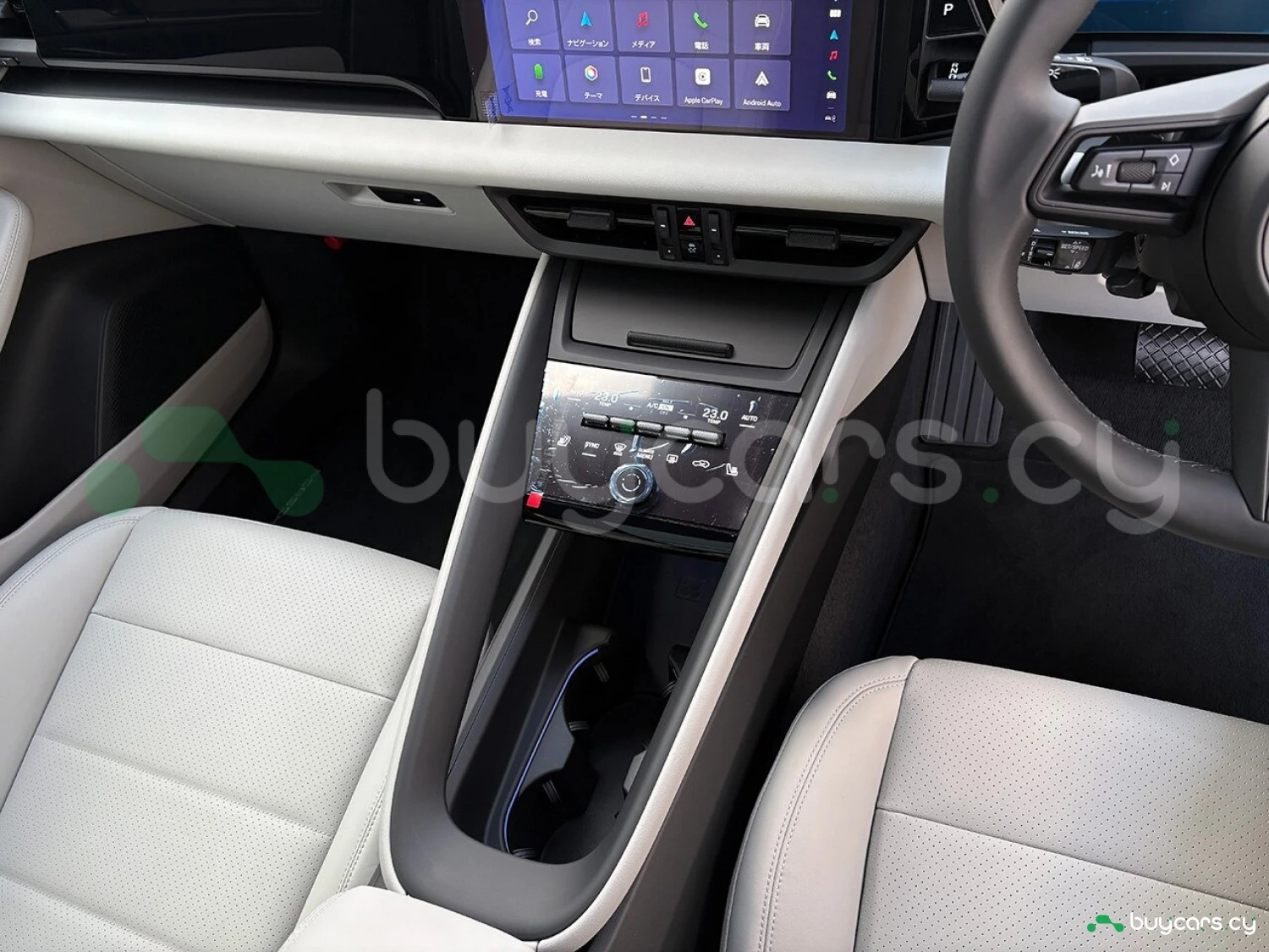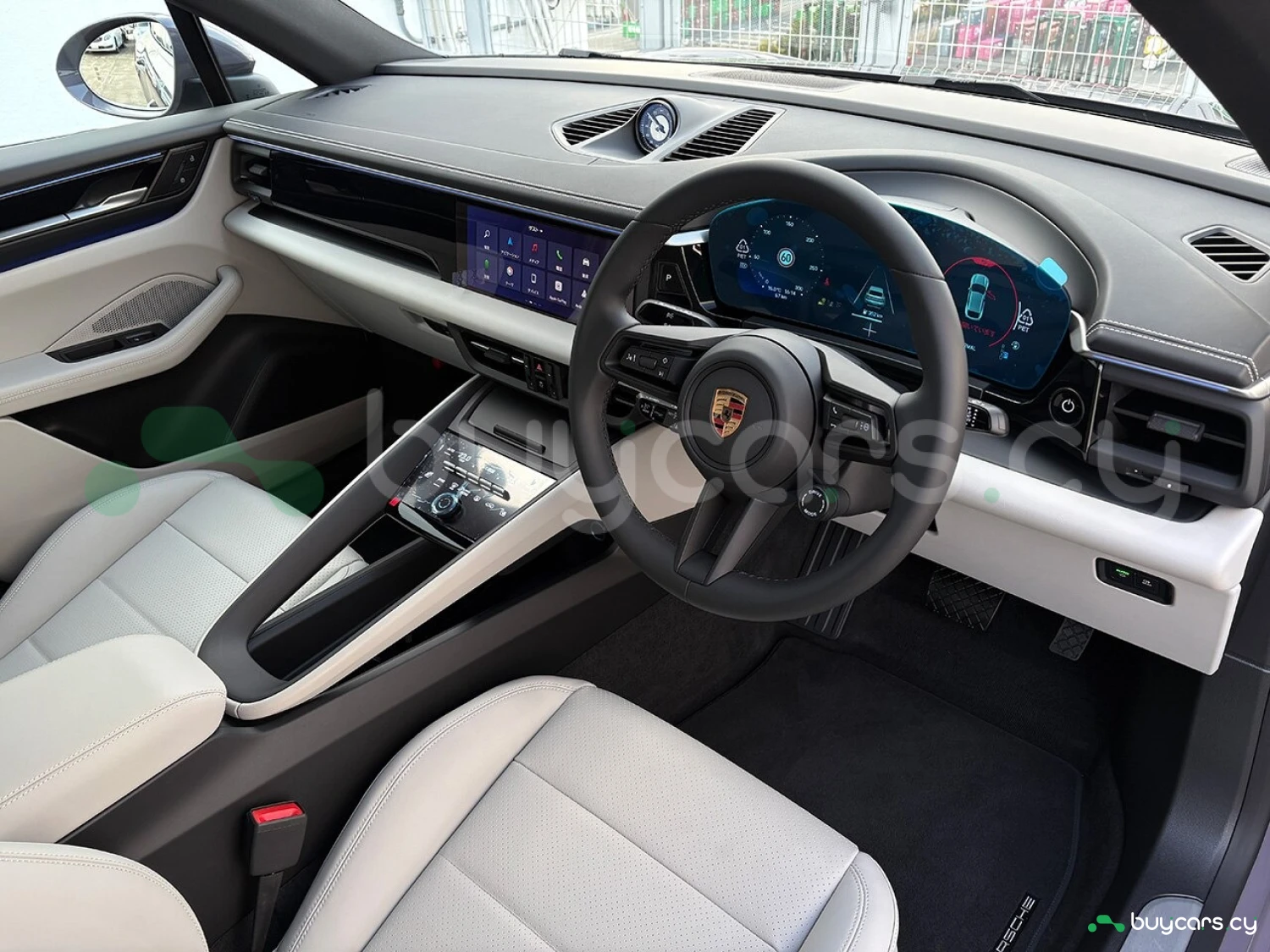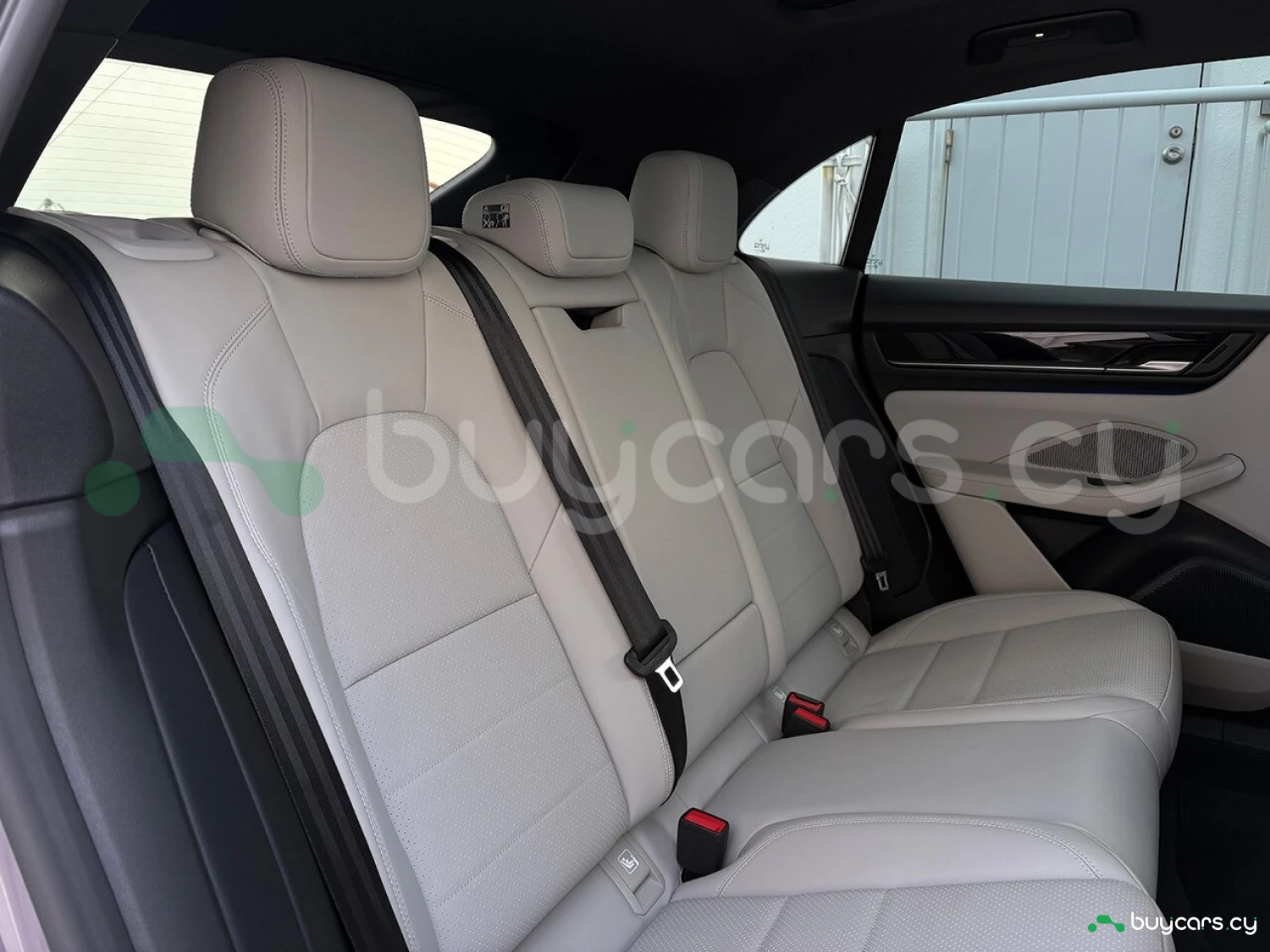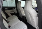 Салон отделан белой кожей, подчёркивая роскошь и чистоту дизайна. На передней панели размещены 12.6-дюймовая цифровая приборная панель, 10.9-дюймовый центральный дисплей, а также дополнительный 10.9-дюймовый экран для пассажира (опция). Информационно-развлекательная система поддерживает Android Auto и Apple CarPlay, предлагая удобную интеграцию смартфона. Также в комплектацию входят подогрев передних и задних сидений, подогрев руля, передние сиденья с электроприводом (14 направлений) и электропривод багажной двери.