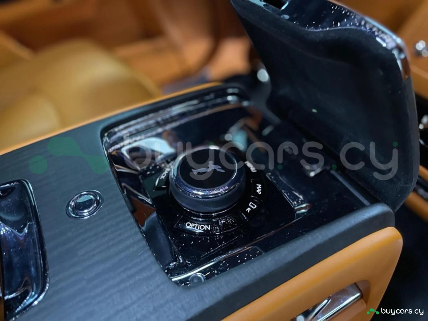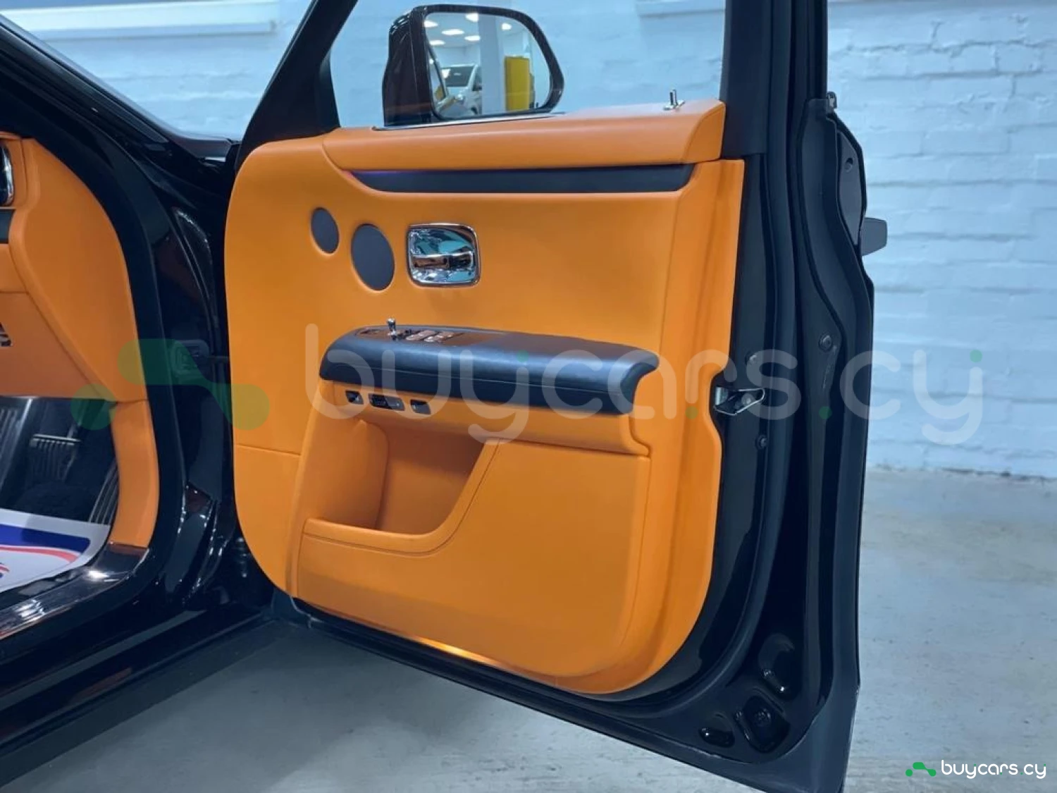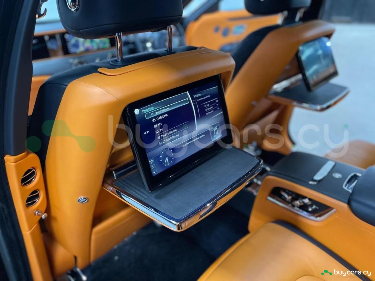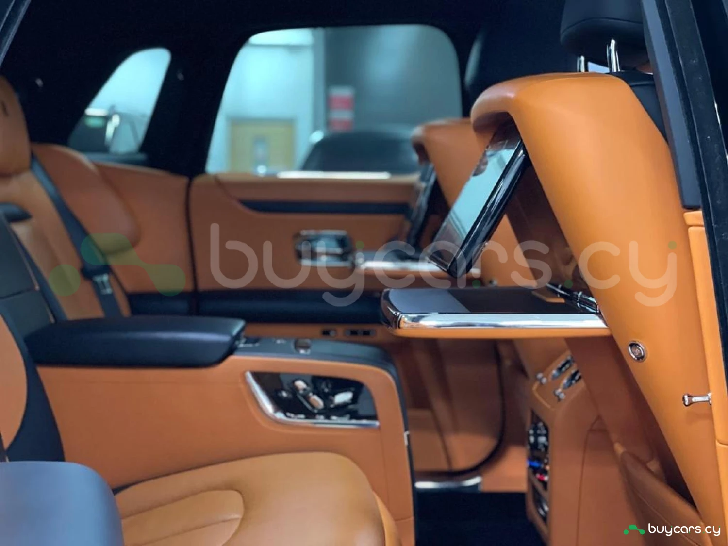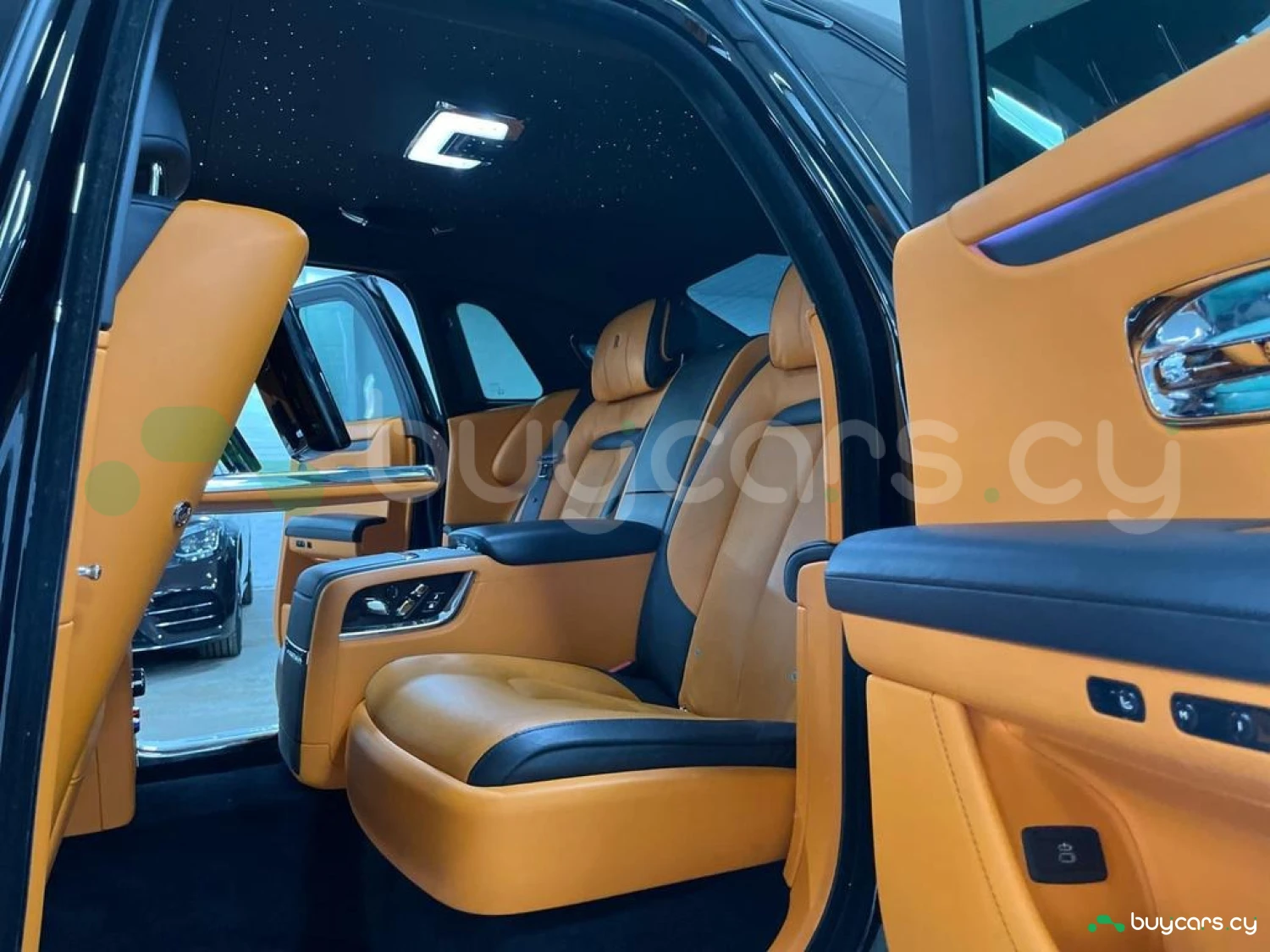Интерьер: Этот Rolls-Royce оформлен в Mono Interior Environment (дополнительная опция) с кожаным салоном Commission Collection - Armagnac (дополнительная опция), дополненным черной обшивкой потолка и ковриками с глубоким ворсом. Охлаждающий отсек Central Cool Chamber (дополнительная опция) добавляет эксклюзивности. Также в салоне есть раскладные столики (дополнительная опция), бесшумно закрывающаяся багажная дверь и подстаканники спереди и сзади.