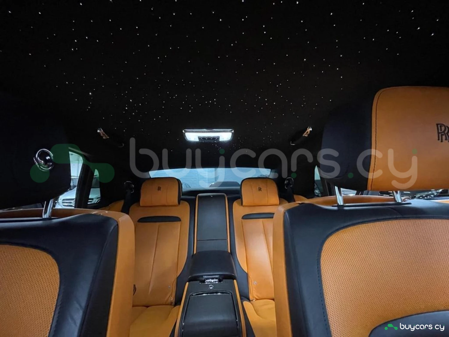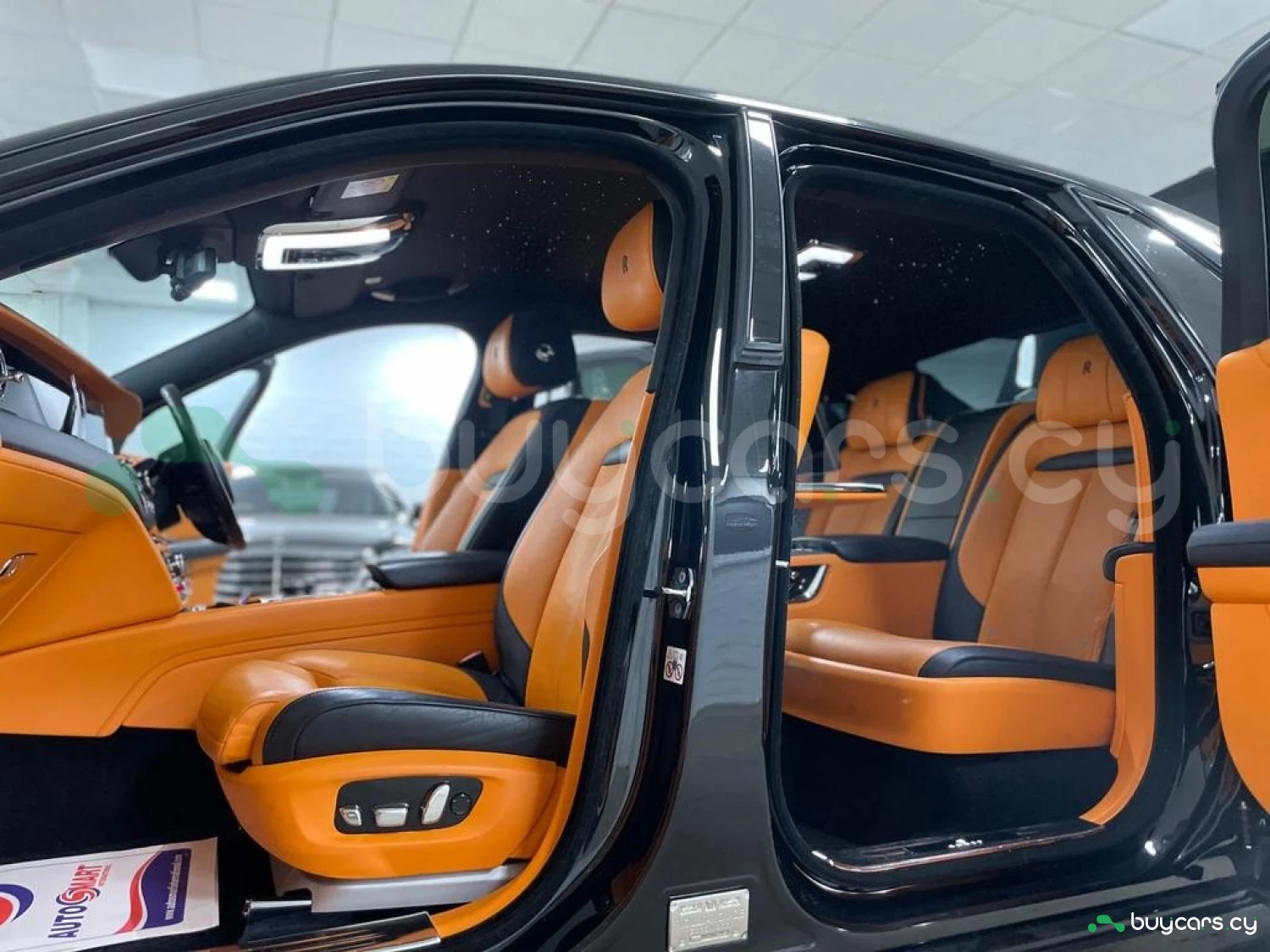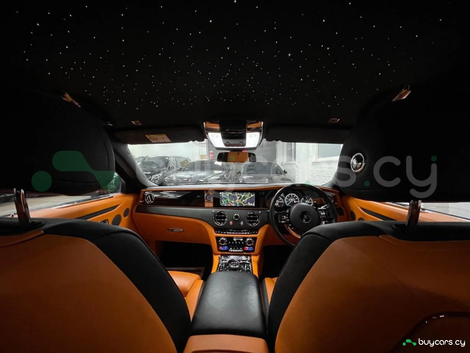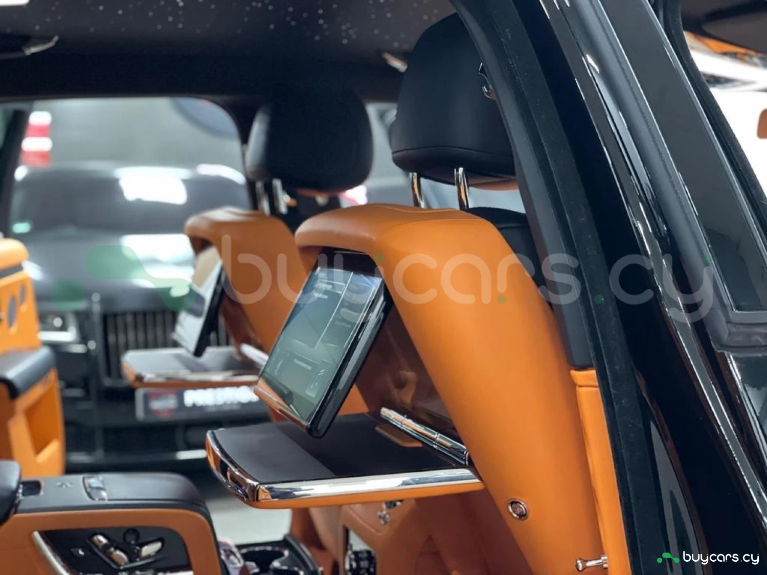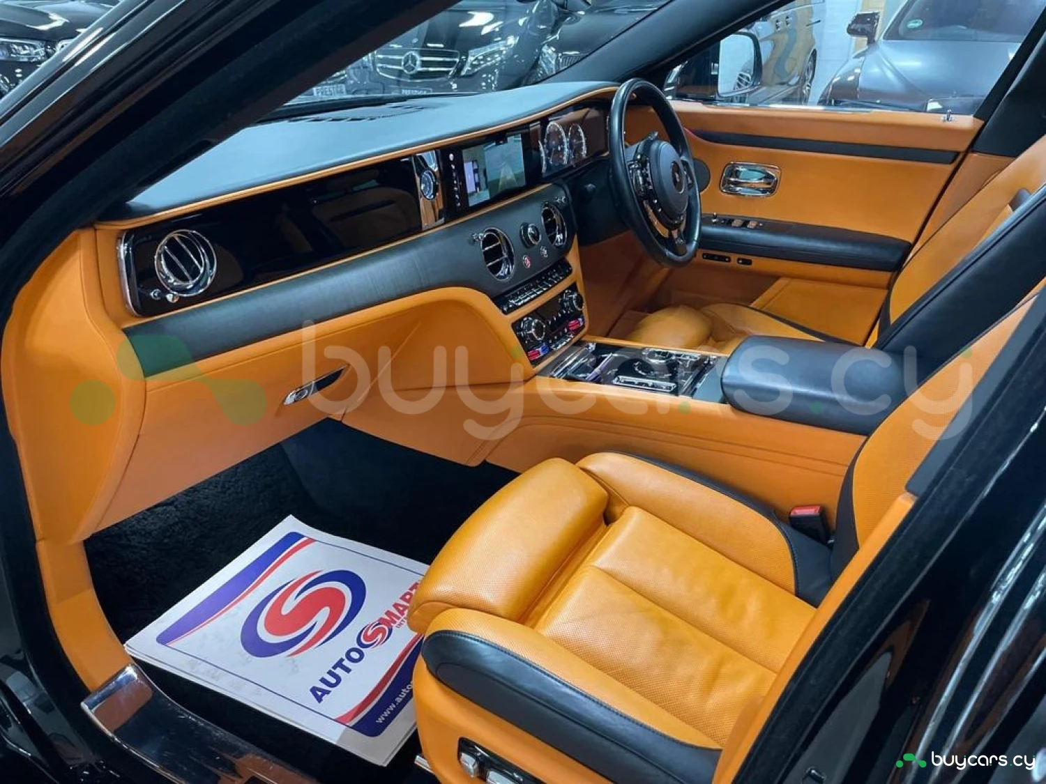 Интерьер: Этот Rolls-Royce оформлен в Mono Interior Environment (дополнительная опция) с кожаным салоном Commission Collection - Armagnac (дополнительная опция), дополненным черной обшивкой потолка и ковриками с глубоким ворсом. Охлаждающий отсек Central Cool Chamber (дополнительная опция) добавляет эксклюзивности. Также в салоне есть раскладные столики (дополнительная опция), бесшумно закрывающаяся багажная дверь и подстаканники спереди и сзади.