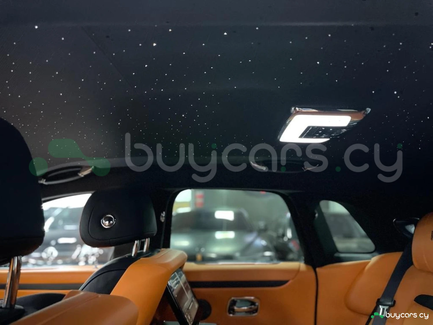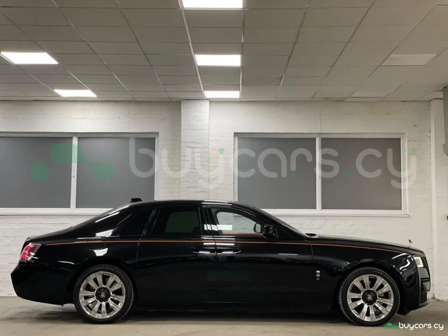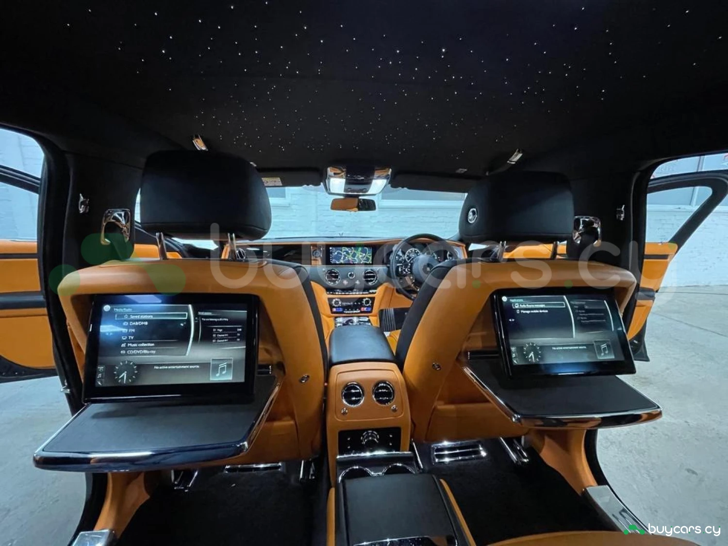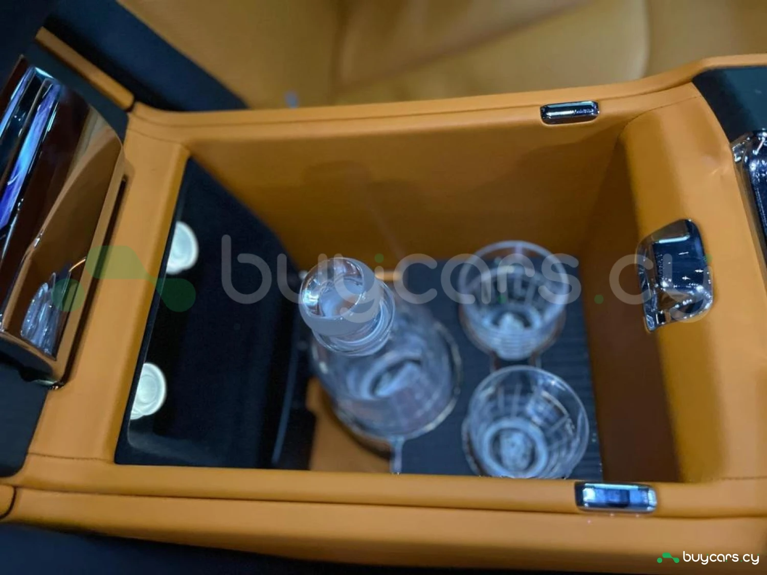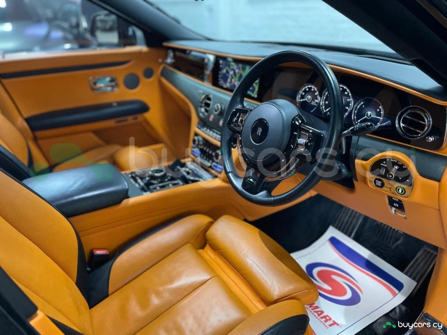 Интерьер: Этот Rolls-Royce оформлен в Mono Interior Environment (дополнительная опция) с кожаным салоном Commission Collection - Armagnac (дополнительная опция), дополненным черной обшивкой потолка и ковриками с глубоким ворсом. Охлаждающий отсек Central Cool Chamber (дополнительная опция) добавляет эксклюзивности. Также в салоне есть раскладные столики (дополнительная опция), бесшумно закрывающаяся багажная дверь и подстаканники спереди и сзади.