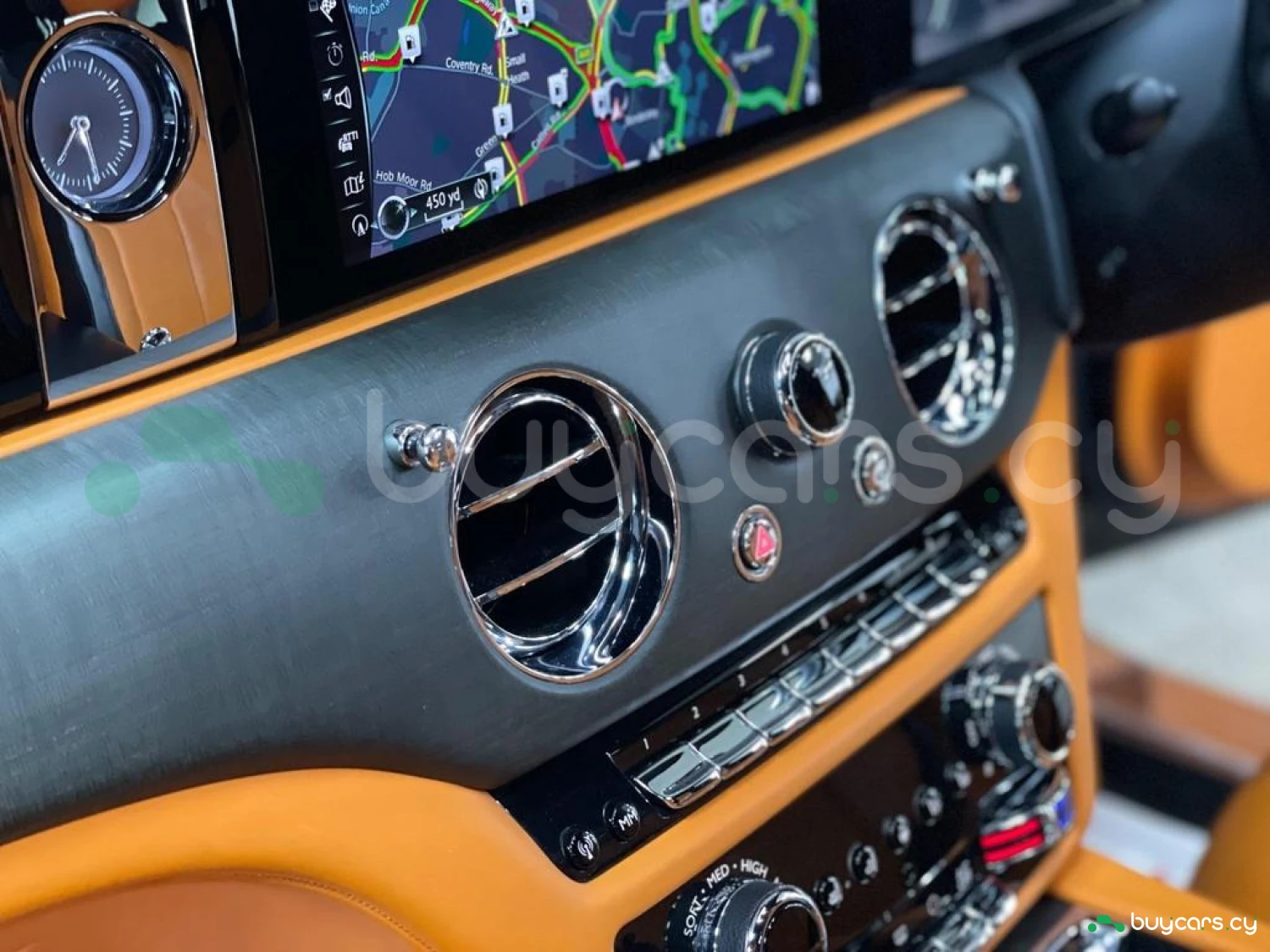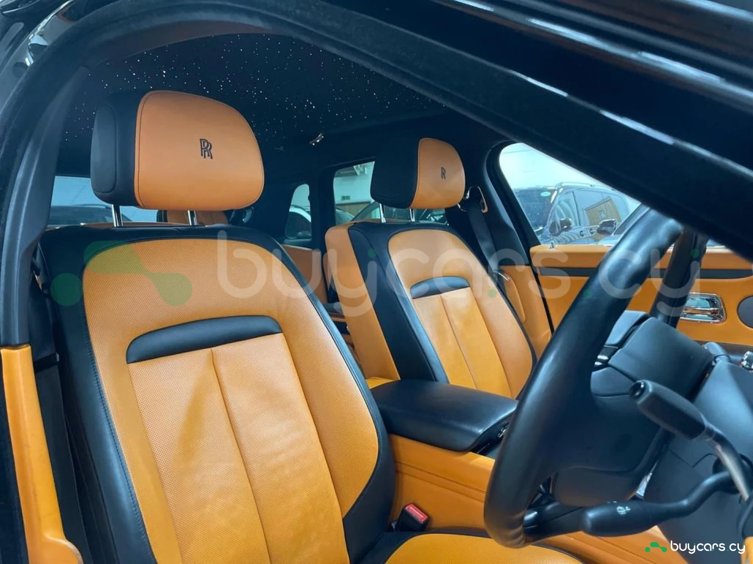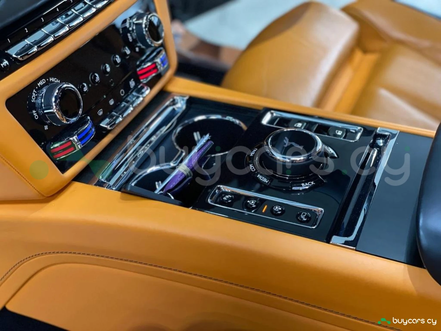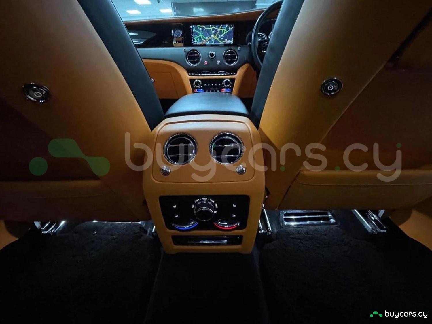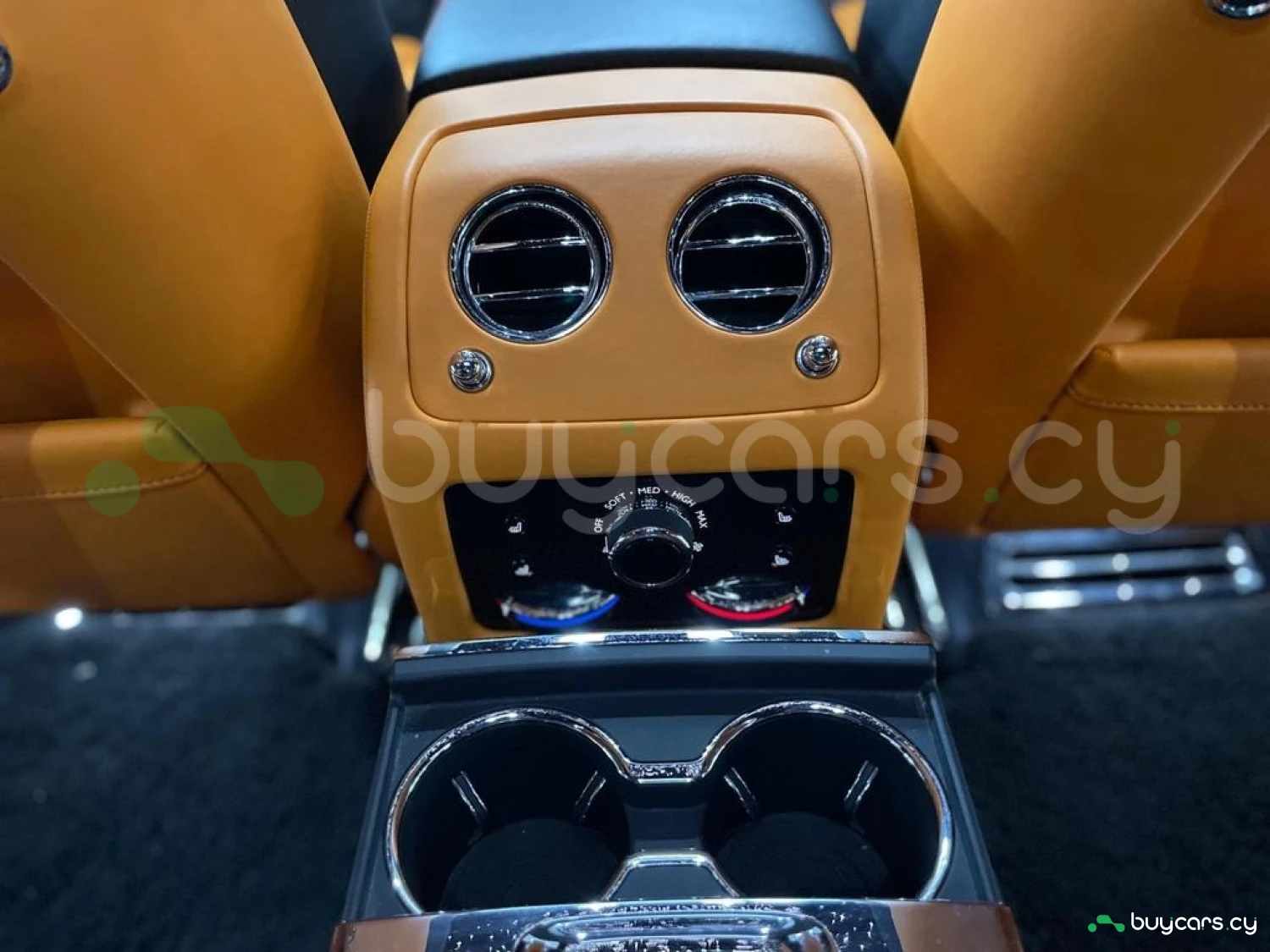 Интерьер: Этот Rolls-Royce оформлен в Mono Interior Environment (дополнительная опция) с кожаным салоном Commission Collection - Armagnac (дополнительная опция), дополненным черной обшивкой потолка и ковриками с глубоким ворсом. Охлаждающий отсек Central Cool Chamber (дополнительная опция) добавляет эксклюзивности. Также в салоне есть раскладные столики (дополнительная опция), бесшумно закрывающаяся багажная дверь и подстаканники спереди и сзади.