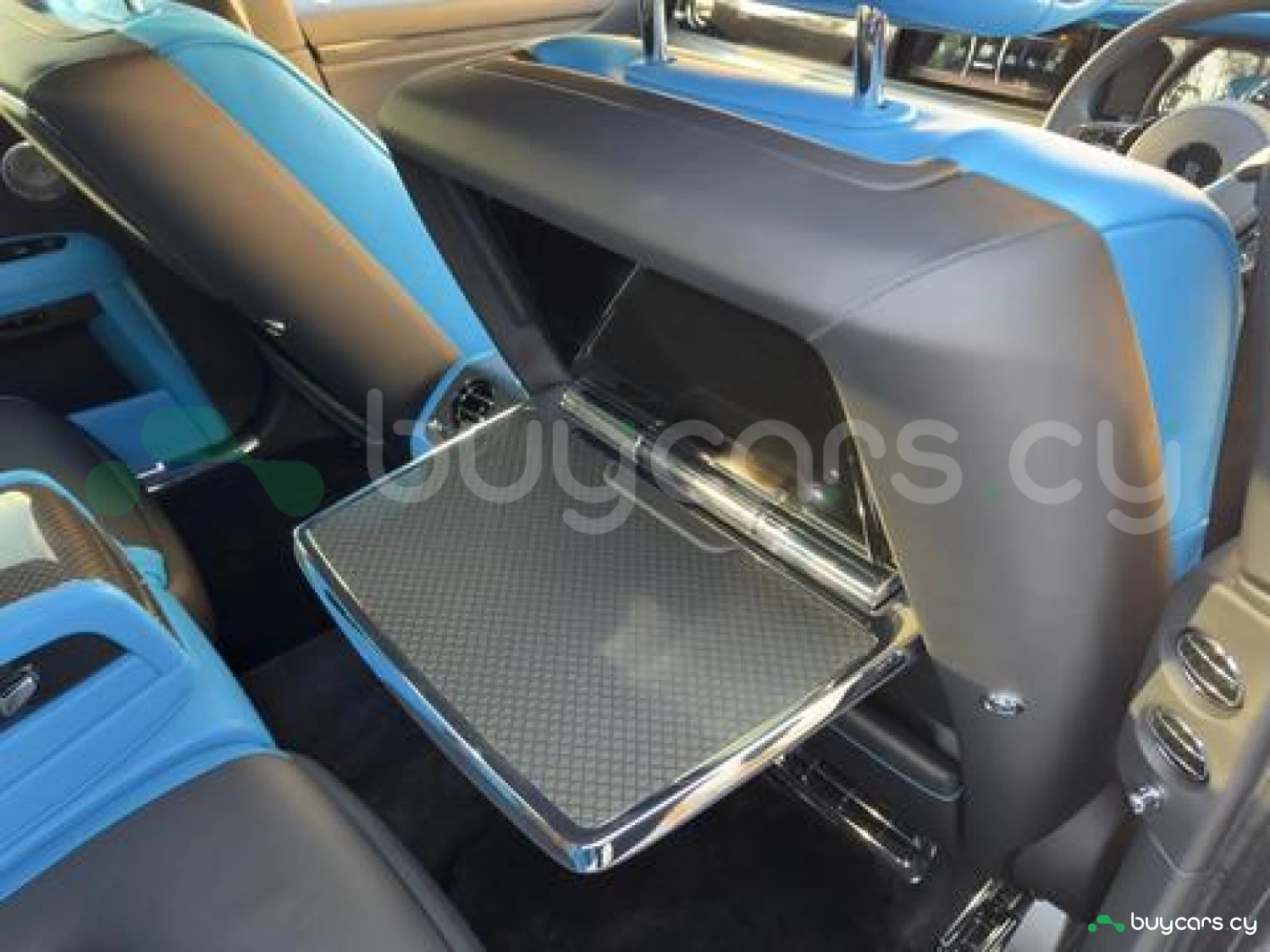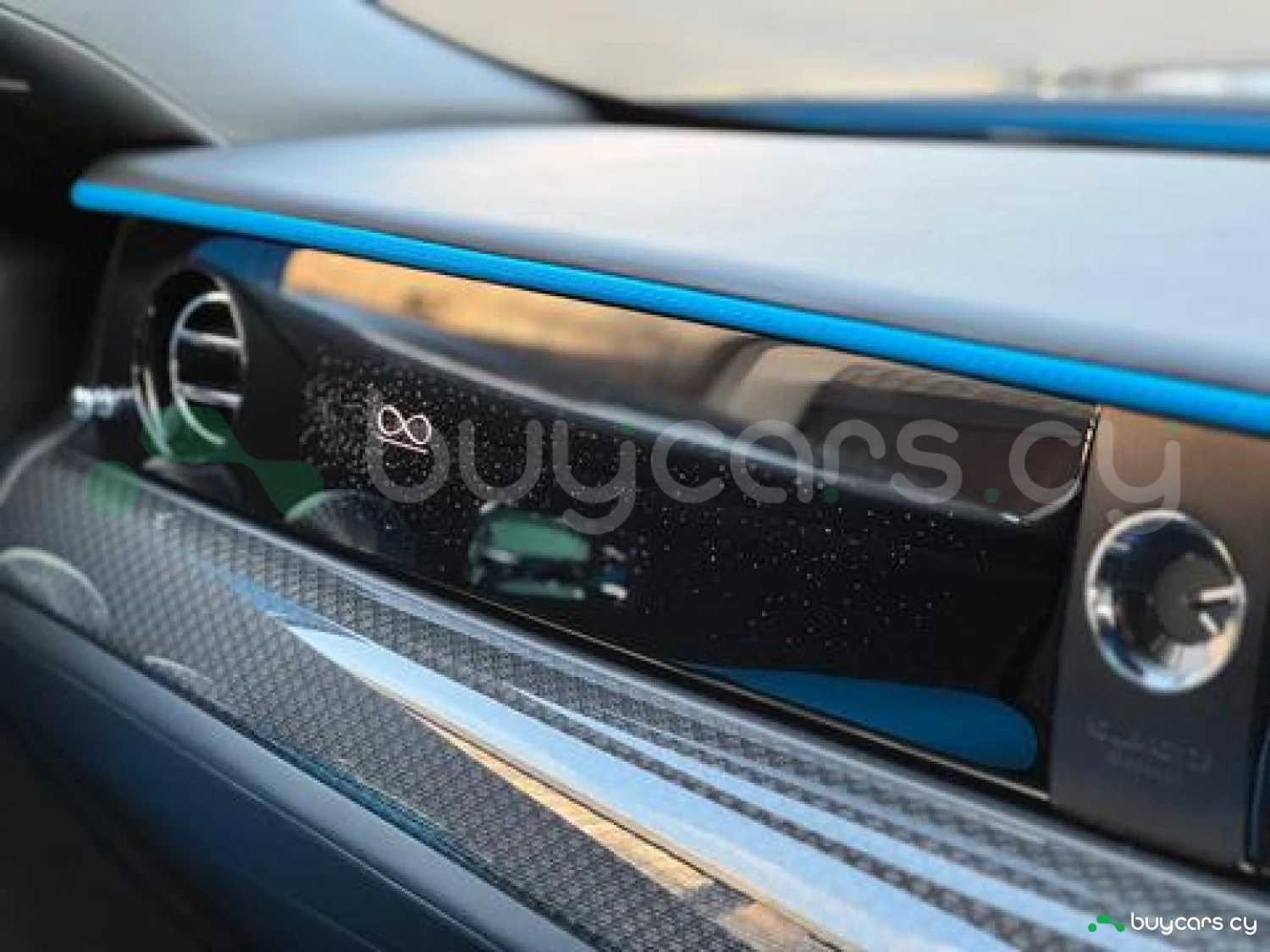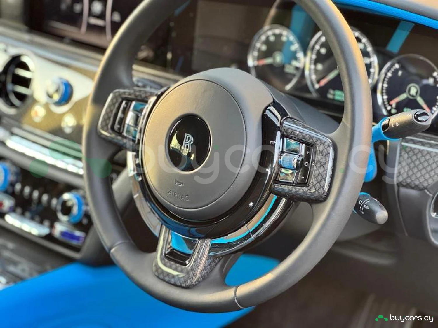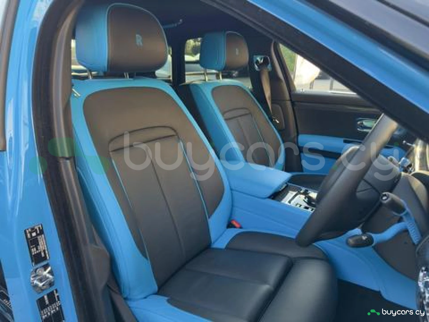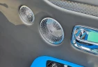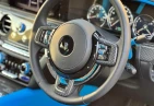 Интерьер: Черная кожа (основная отделка), кожа Galileo Blue (вторичная отделка), Rolls-Royce Bespoke Audio, подогрев и вентиляция передних сидений с массажем, подогрев задних сидений, массаж задних сидений, звездный потолок Shooting Star, подсвеченная передняя панель, часы Dynamic Bespoke, RR Monogram на подголовниках, контрастная прострочка и канты в цвете Galileo Blue, кожаные ручки в Galileo Blue, карбоновый шпон Black Badge Technical Fibre Veneer, расширенная кожаная отделка потолка.