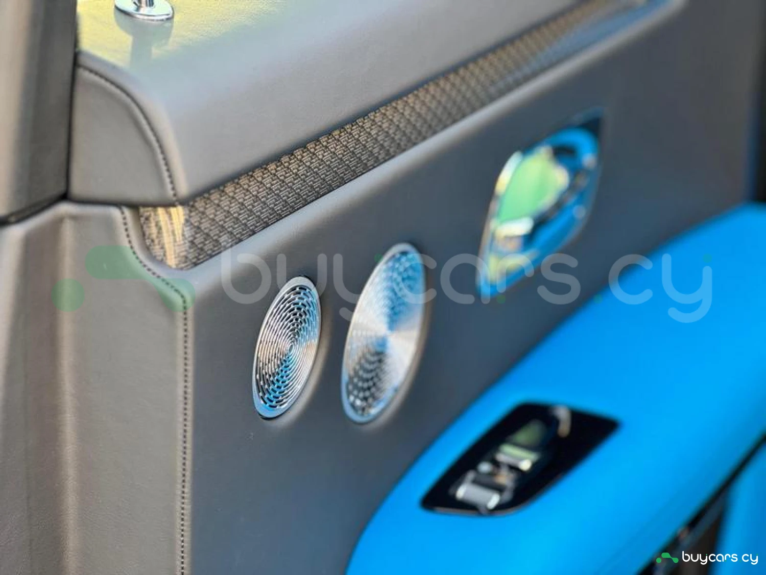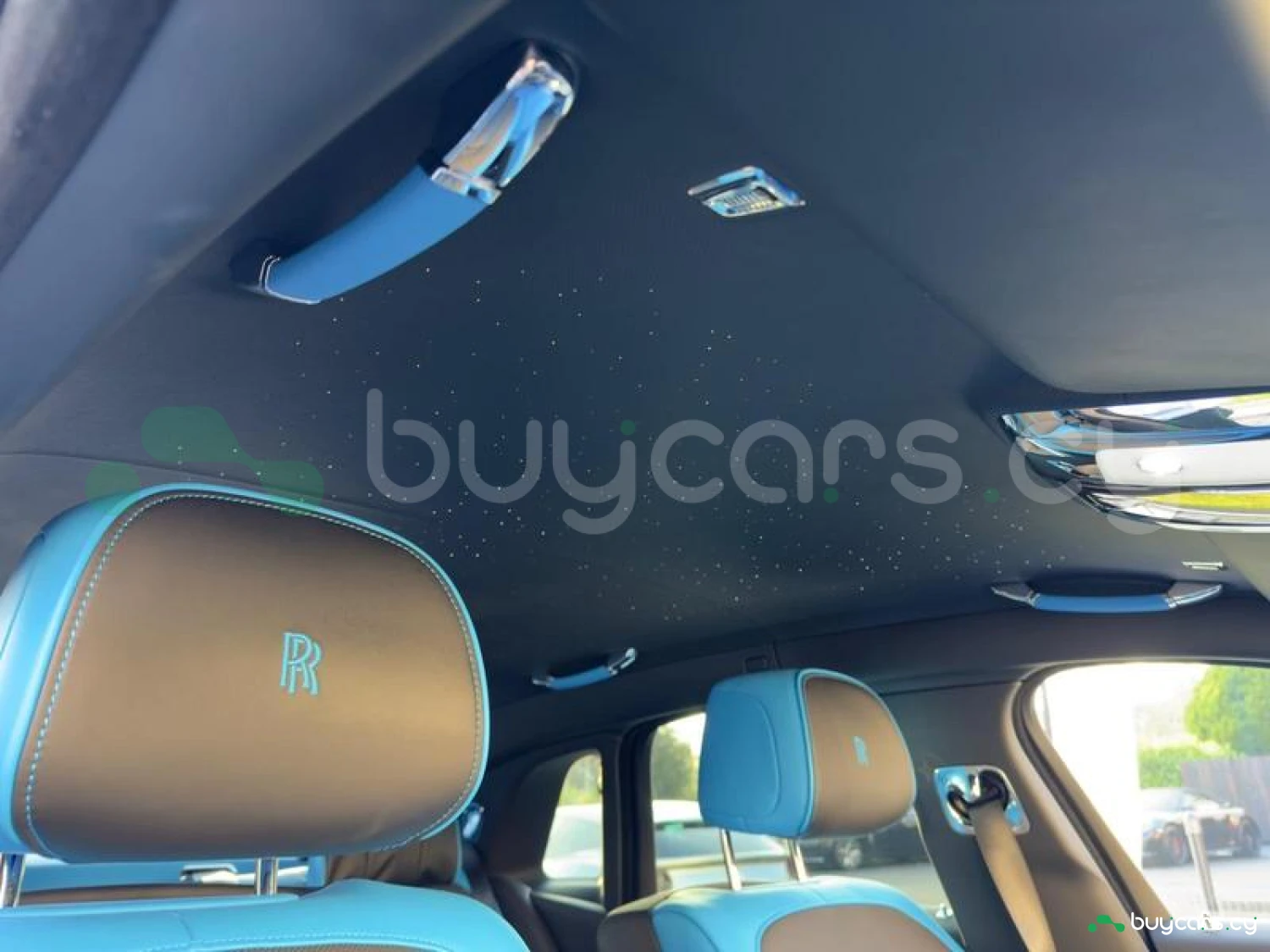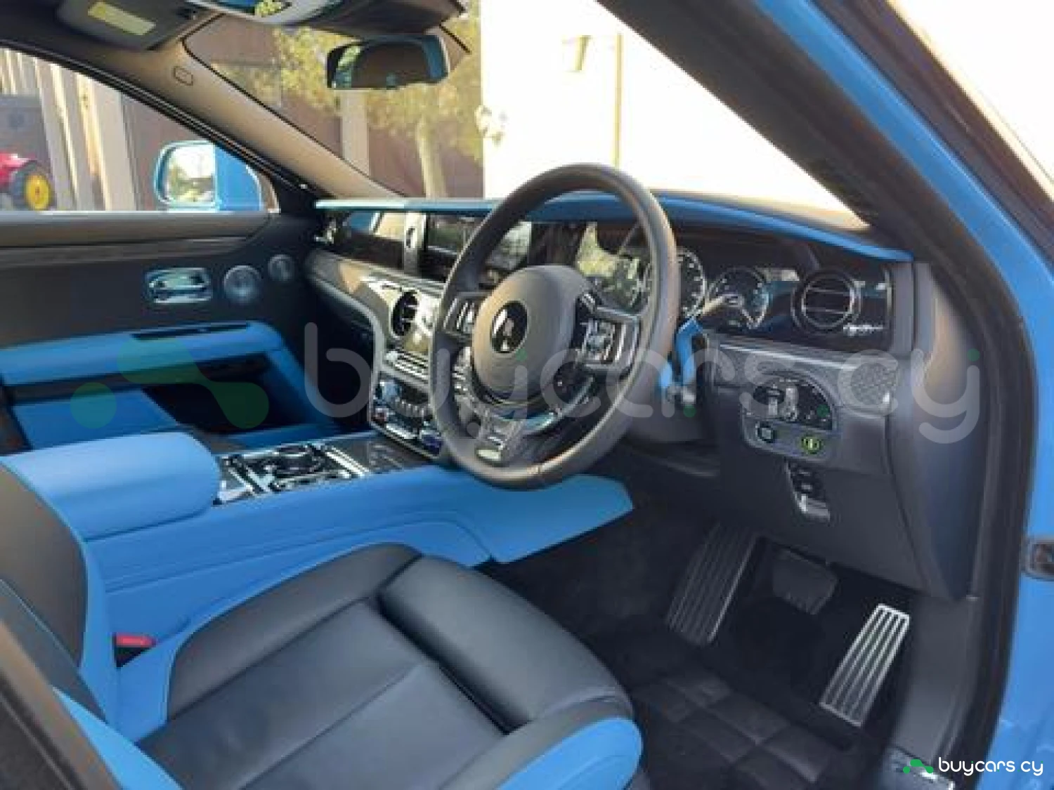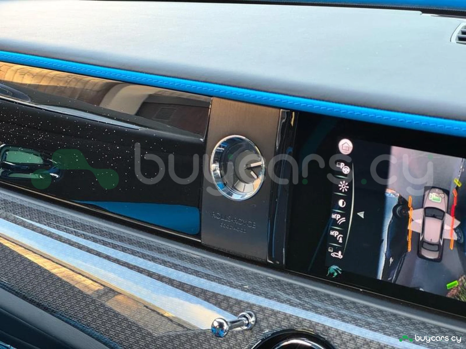 Интерьер: Черная кожа (основная отделка), кожа Galileo Blue (вторичная отделка), Rolls-Royce Bespoke Audio, подогрев и вентиляция передних сидений с массажем, подогрев задних сидений, массаж задних сидений, звездный потолок Shooting Star, подсвеченная передняя панель, часы Dynamic Bespoke, RR Monogram на подголовниках, контрастная прострочка и канты в цвете Galileo Blue, кожаные ручки в Galileo Blue, карбоновый шпон Black Badge Technical Fibre Veneer, расширенная кожаная отделка потолка.