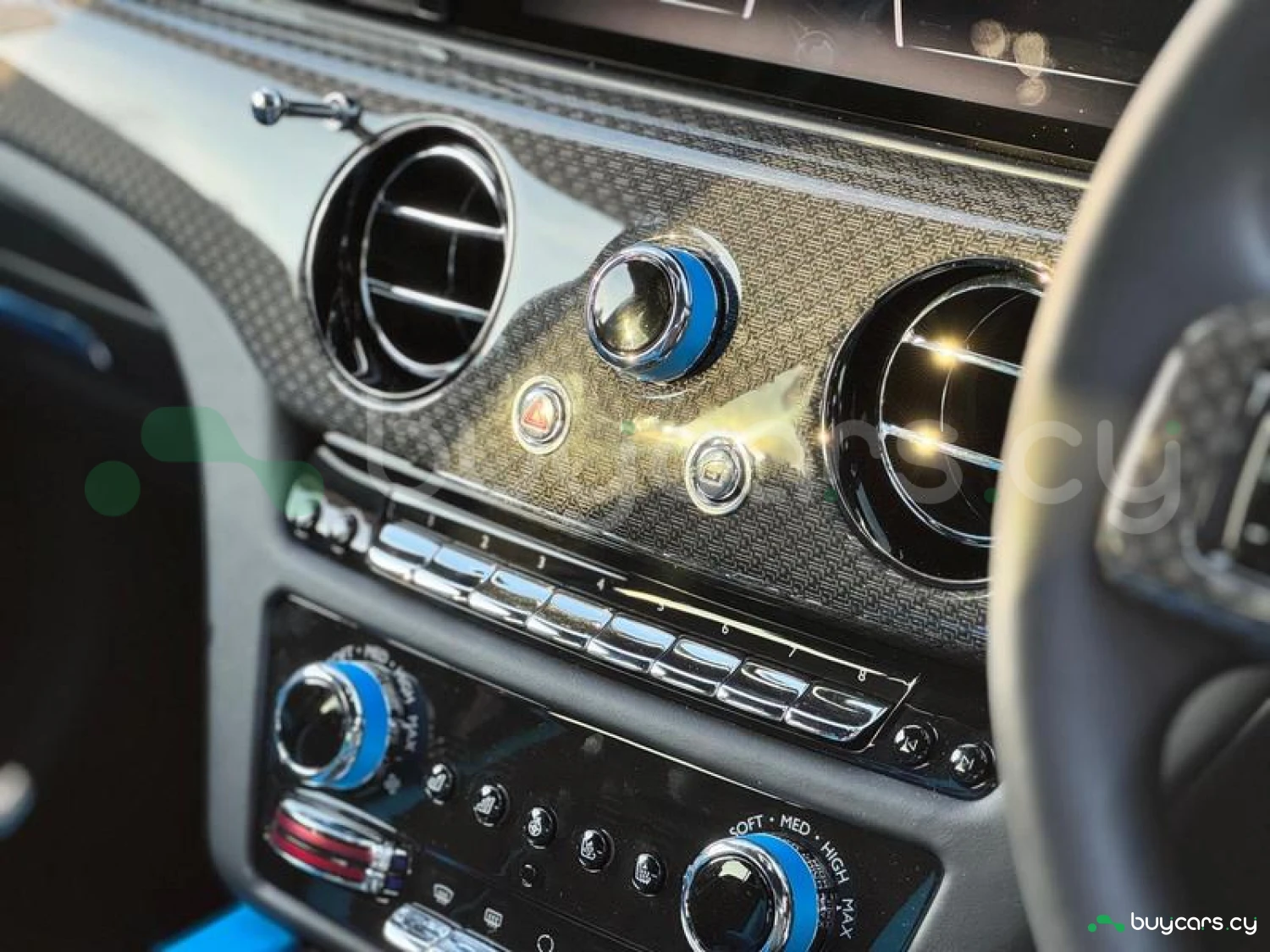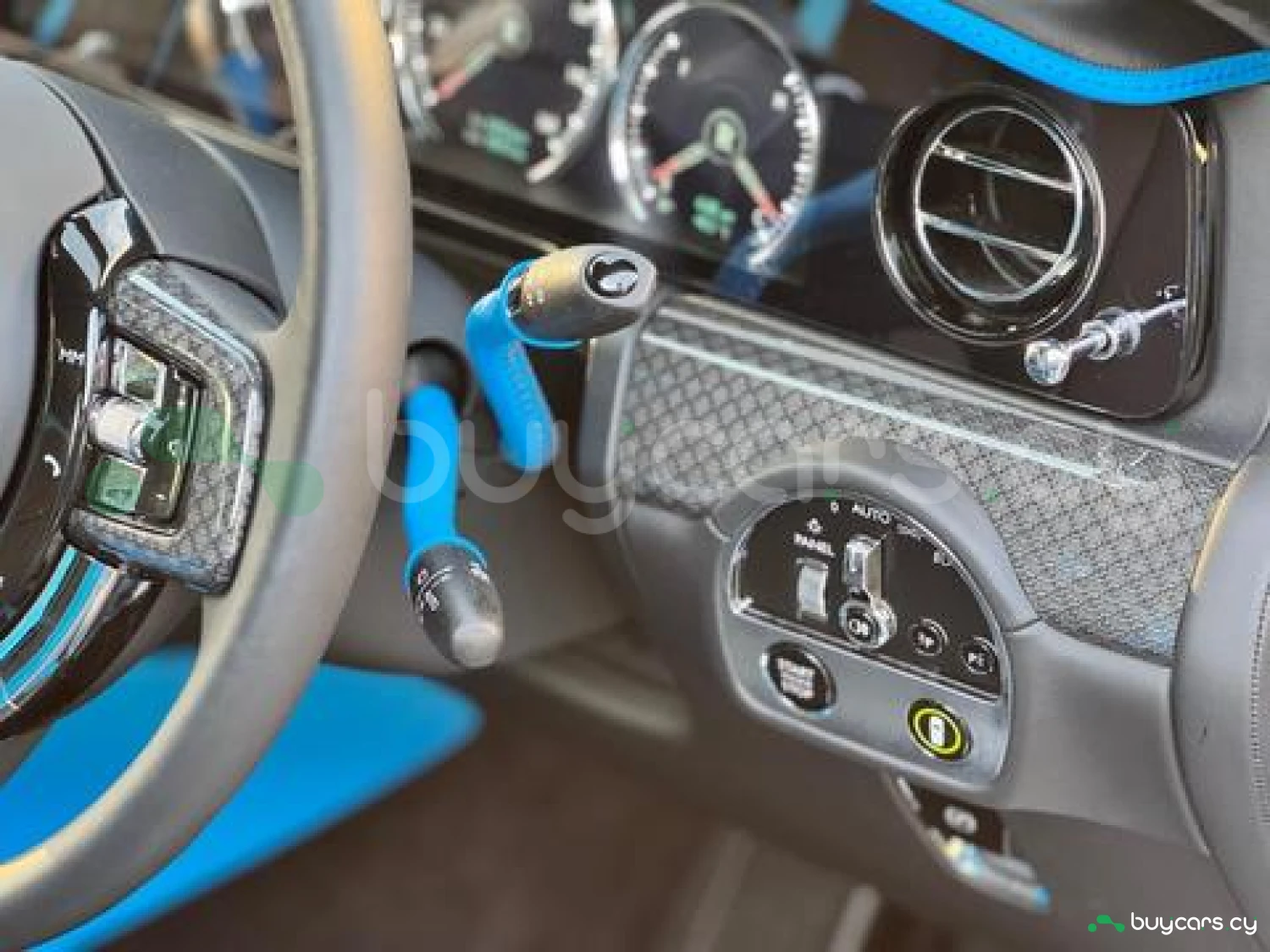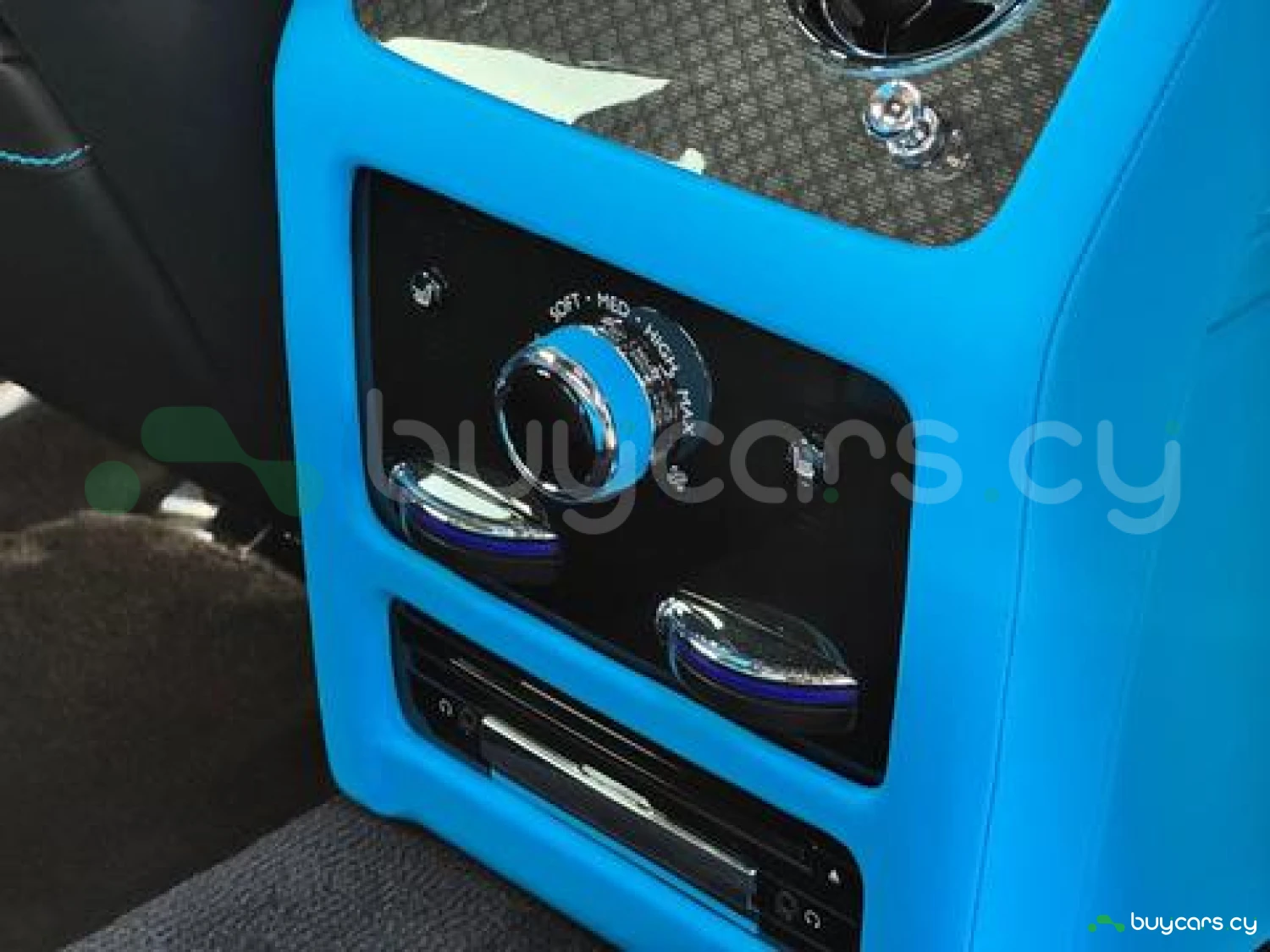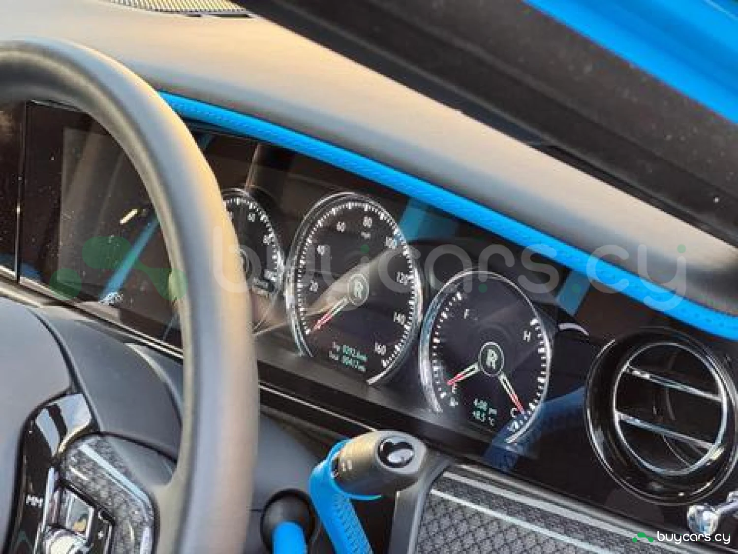 Интерьер: Черная кожа (основная отделка), кожа Galileo Blue (вторичная отделка), Rolls-Royce Bespoke Audio, подогрев и вентиляция передних сидений с массажем, подогрев задних сидений, массаж задних сидений, звездный потолок Shooting Star, подсвеченная передняя панель, часы Dynamic Bespoke, RR Monogram на подголовниках, контрастная прострочка и канты в цвете Galileo Blue, кожаные ручки в Galileo Blue, карбоновый шпон Black Badge Technical Fibre Veneer, расширенная кожаная отделка потолка.